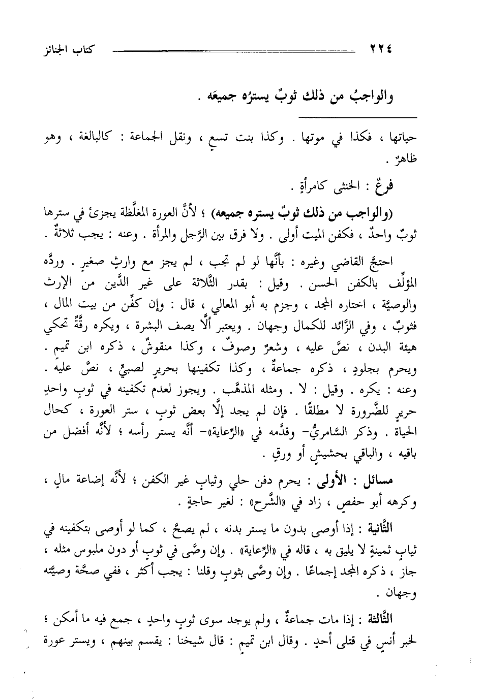 احتج القاضي وغيره بأنها لو لم تجب لم يجز مع وارث صغير ورده المؤلف بالكفن الحسن وقيل بقدر الثلاثة على غير الدين من الإرث والوصية اختاره المجد وجزم به أبو المعالي قال وإن كفن من بيت المال فثوب وفي الزائد للكمال وجهان ويعتبر أن لا يصف البشرة ويكره رقة تحكي هيأة البدن نص عليه وشعر وصوف وكذا منقوش ذكره ابن تميم ويحرم بجلود ذكره جماعة وكذا تكفينها بحرير لصبي نص عليه وعنه يكره وقيل لا ومثله المذهب ويجوز لعدم تكفينه في ثوب واحد حرير للضرورة لا مطلقا فإن لم يجد إلا بعض ثوب ستر العورة كحال الحياة وذكر السامري وقدمه في الرعاية أنه يستر رأسه لأنه أفضل من باقيه والباقي بحشيش أو ورق