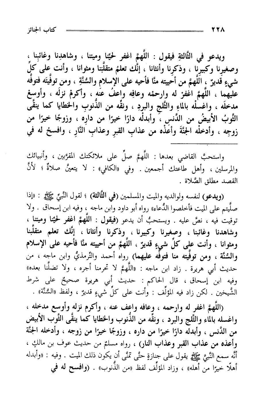 ويدعو في الثالثة فيقول اللهم اغفر لحينا وميتنا وشاهدنا وغائبنا وصغيرنا وكبيرنا وذكرنا وأنثانا إنك تعلم متقلبنا ومثوانا وأنت على كل شيء قدير اللهم من أحييته منا فأحيه على الإسلام والسنة ومن توفيته فتوفه عليهما اللهم اغفر له وارحمه وعافه واعف عنه وأكرم نزله وأوسع مدخله واغسله بالماء والثلج والبرد ونقه من الذنوب والخطايا كما ينقى الثوب الأبيض من الدنس وأبدله دارا خيرا من داره وزوجا خير من زوجه وأدخله الجنة وأعذه من عذاب القبر وعذاب النار وافسح له في.