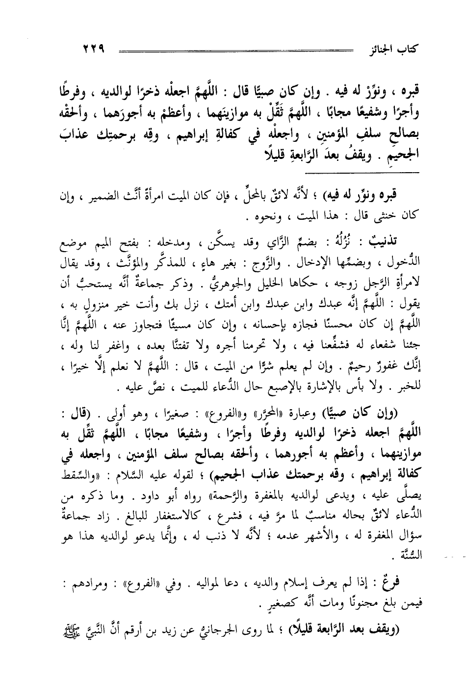 قبره ونور له فيه وإن كان صبيا قال اللهم اجعله ذخرا لوالديه وفرطا وأجرا وشفيعا مجابا اللهم ثقل به موازينهما وأعظم به أجورهما وألحقه بصالح سلف المؤمنين واجعله في كفالة إبراهيم وقه برحمتك عذاب الجحيم ويقف بعد الرابعة قليلا
