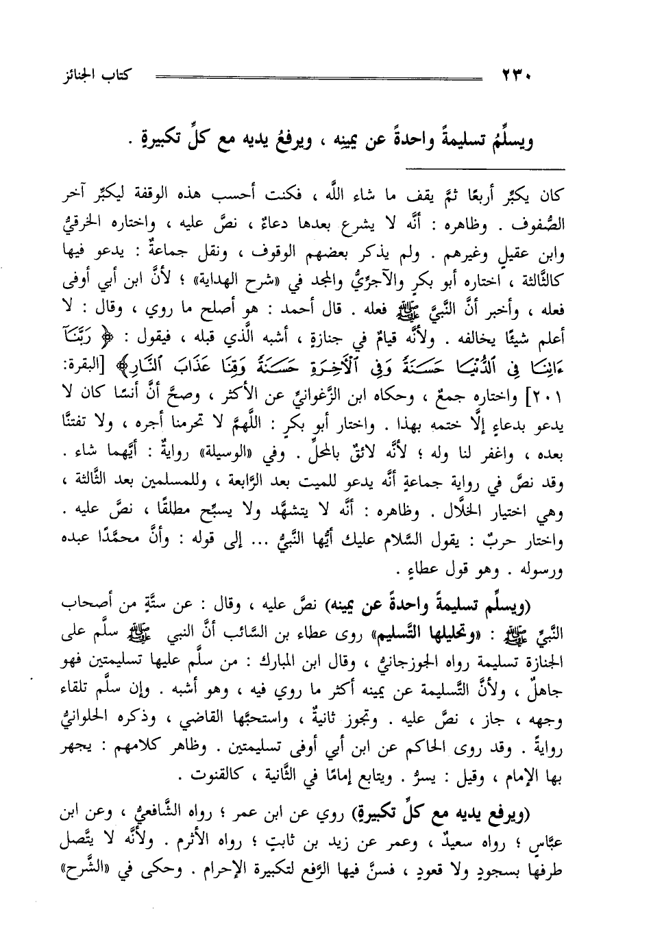 ويسلم تسليمة واحدة عن يمينه ويرفع يديه مع كل تكبيرة.