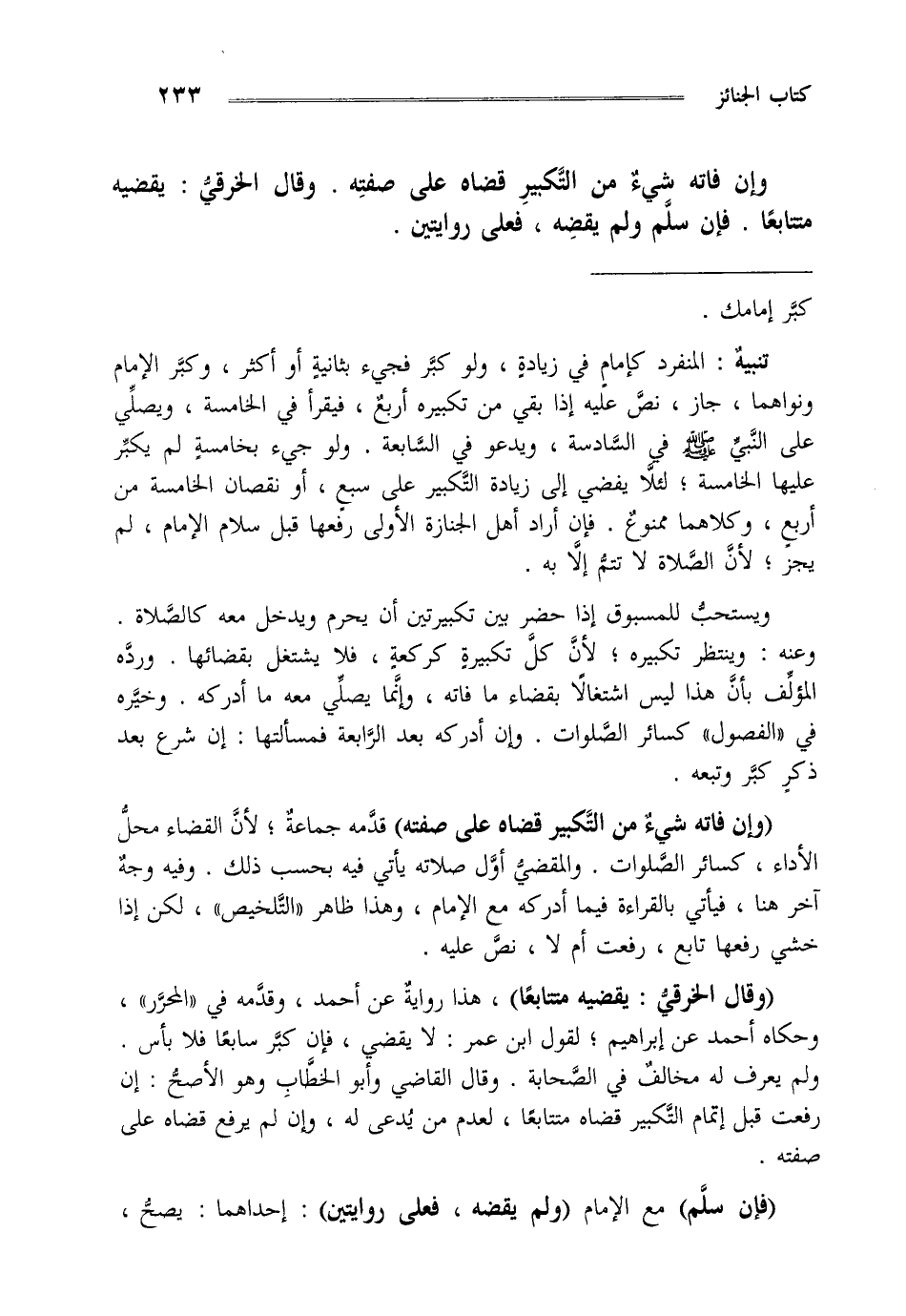 تنبيه: المنفرد كإمام في زيادة ولو كبر فجيء بثانية أو أكثر وكبر الإمام ونواهما جاز نص عليه إذا بقي من تكبيره أربع فيقرأ في الخامسة ويصلي على النبي صلى الله عليه وسلم في السادسة ويدعو في السابعة ولو جيء بخامسة لم يكبر عليها الخامسة لئلا يفضي إلى زيادة التكبير على سبع أو نقصان الخامسة من أربع وكلاهما ممنوع فإن أراد أهل الجنازة الأولى رفعها قبل سلام الإمام لم يجز لأن الصلاة لا تتم إلا به