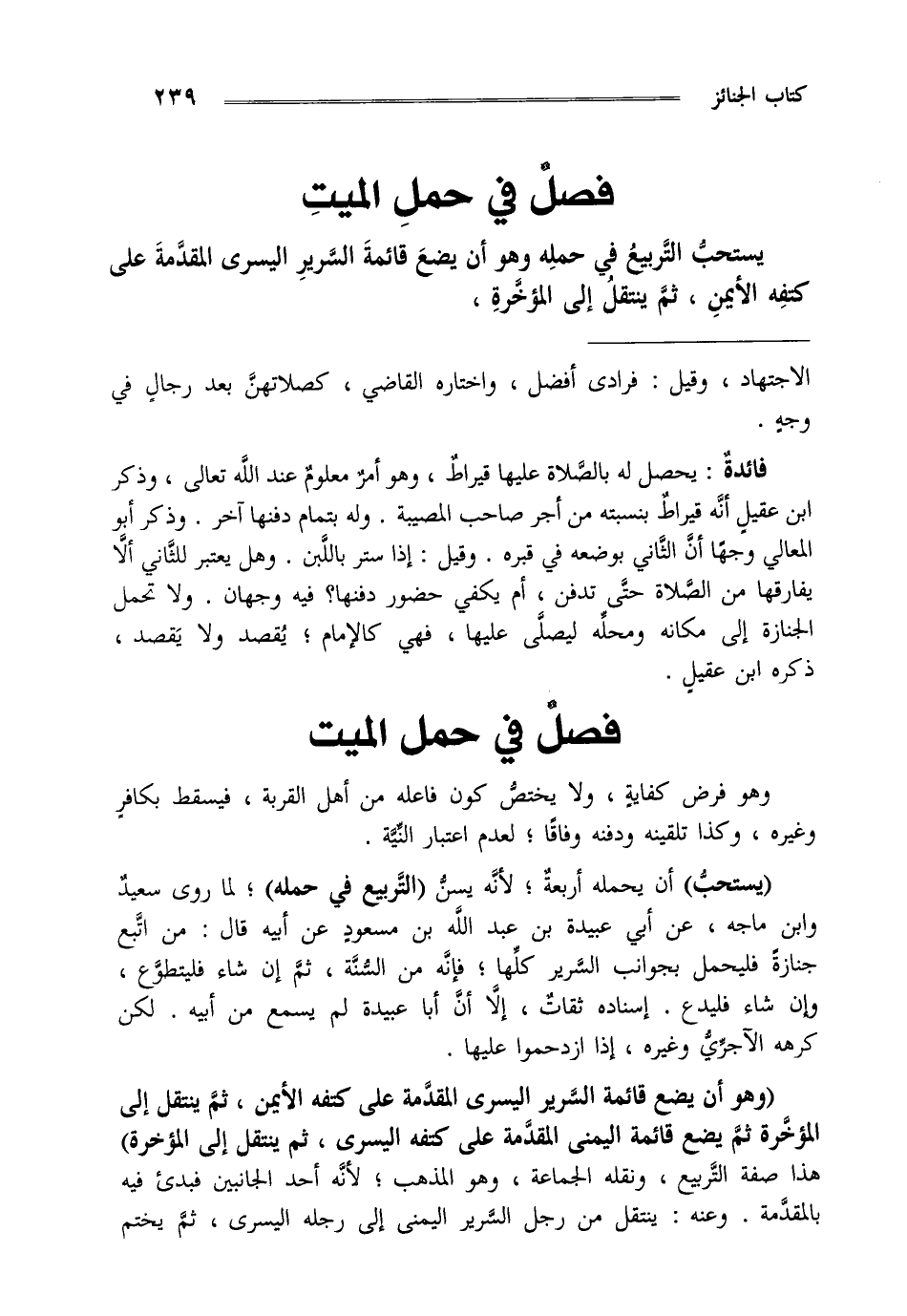 "وهو أن يضع قائمة السرير اليسرى المقدمة على كتفه الأيمن ثم ينتقل إلى المؤخرة ثم يضع قائمة اليمنى المقدمة على كتفه اليسرى ثم ينتقل إلى المؤخرة" هذا صفة التربيع ونقله الجماعة وهو المذهب لأنه أحد الجانبين فبدئ فيه بالمقدمة وعنه ينتقل من رجل السرير اليمنى إلى رجله اليسرى ثم يختم