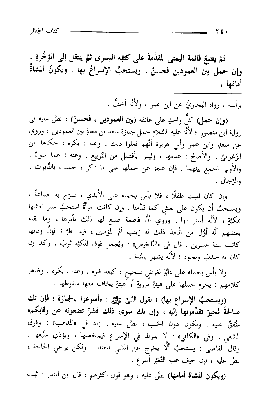 "ويستحب الإسراع بها" لقول النبي صلى الله عليه وسلم "أسرعوا بالجنازة فإن تك صالحة فخير تقدمونها إليه وإن تك سوى ذلك فشر تضعونه عن رقابكم" متفق عليه ويكون دون الخبب نص عليه زاد في المذهب وفوق السعي وفي الكافي لا يفرط في الإسراع فيمخضها ويؤذي متبعها وقال القاضي يستحب أن لا يخرج عن المشي المعتاد ولكن يراعي الحاجة نص عليه فإن خيف عليه التغير أسرع.