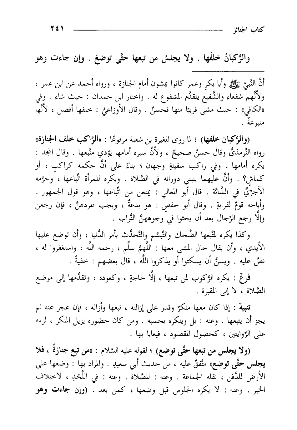 والركبان خلفها ولا يجلس من تبعها حتى توضع وإن جاءت وهو.