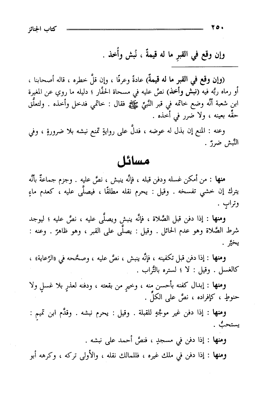 "وإن وقع في القبر ماله قيمة" عادة وعرفا وإن قل خطره قاله أصحابنا أو رماه ربه فيه "نبش وأخذ" نص عليه في مسحاة الحفار دليله ما روي عن المغيرة بن شعبة أنه وضع خاتمة في قبر النبي صلى الله عليه وسلم فقال خاتمي فدخل وأخذه ولتعلق حقه بعينه ولا ضرر في أخذه.