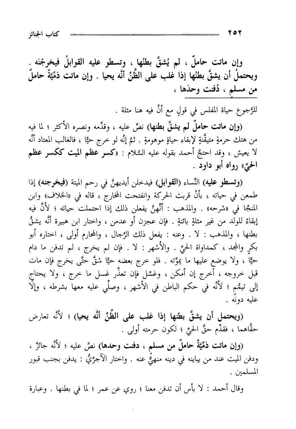 "وتسطو عليه" النساء "القوابل" فيدخلن أيديهن في رحم الميتة "فيخرجنه" إذا طمعن في حياته بأن قربت الحركة وانفتحت المخارج قاله في الخلاف وابن المنجا في شرحه والمذهب أنهن يفعلن ذلك إذا احتملت حياته لأن فيه إبقاء للولد من غيرمثلة بائنة فإن عجزن أو عدمن واختار ابن هبيرة أنه يشق بطنها والمذهب لا وعنه يفعل ذلك الرجال والمحارم أولى اختاره أبو بكر والمجد كمداواة الحي والأشهر لا فإن لم يخرج لم تدفن ما دام حيا ولا يوضع عليها ما يموته فلو خرج بعضه حيا شق حتى يخرج فإن مات قبل خروجه أخرج إن أمكن وغسل فإن تعذر غسل ما خرج ولا يحتاج إلى تيمم لأنه في حكم الباطن في الأشهر وصلي عليه معها بشرطه وإلا عليه دونه