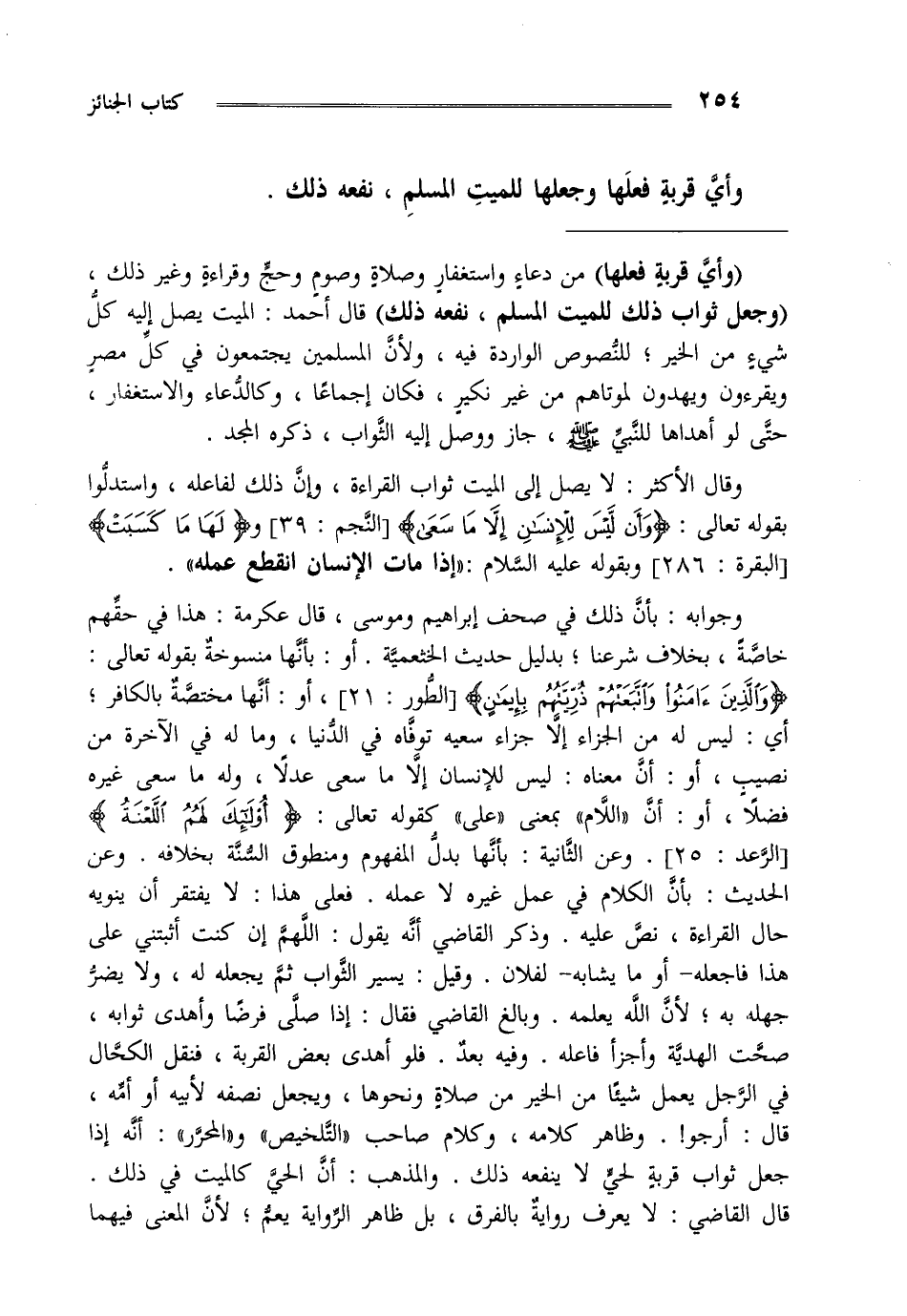 وجوابه بأن ذلك في صحف إبراهيم وموسى قال عكرمة هذا في حقهم خاصة بخلاف شرعنا بدليل حديث الخثعمية أو بأنها منسوجة بقوله تعالى {وَالَّذِينَ آمَنُوا وَاتَّبَعَتْهُمْ ذُرِّيَّتُهُمْ بِإِيمَانٍ} [الطور: من الآية21] أو أنها مختصة بالكافر أي ليس له من الجزاء إلا جزاء سعيه توفاه في الدنيا وماله في الآخرة من نصيب أو أن معناه ليس للإنسان إلا ما سعى عدلا وله ما سعى غيره فضلا أو أن اللام بمعنى على لقوله تعالى {أُولَئِكَ لَهُمُ اللَّعْنَةُ} [الرعد: من الآية25] وعن الثانية بأنها بدل المفهوم ومنطوق السنة بخلافه وعن الحديث بأن الكلام في عمل غيره لا عمله فعلى هذا لا يفتقر أن ينويه حال القراءة نص عليه وذكر القاضي أنه يقول اللهم إن كنت أثبتني على هذا فاجعله أو ما يشابه لفلان وقيل يسير الثواب ثم يجعله له ولا يضر جهله به لأن الله يعلمه وبالغ القاضي فقال إذا صلى فرضا وأهدى ثوابه صحت الهدية وأجزأ فاعله وفيه بعد فلو أهدى بعض القربة فنقل الكحال في الرجل يعمل شيئا من الخير من الصلاة ونحوها ويجعل نصفه لأبيه أو أمه قال أرجو وظاهر كلامه وكلام صاحب التلخيص والمحرر أنه إذا جعل ثواب قربة لحي لا ينفعه ذلك والمذهب أن الحي كالميت في ذلك قال القاضي لا يعرف رواية بالفرق بل ظاهر الرواية يعم لأن المعنى فيهما.