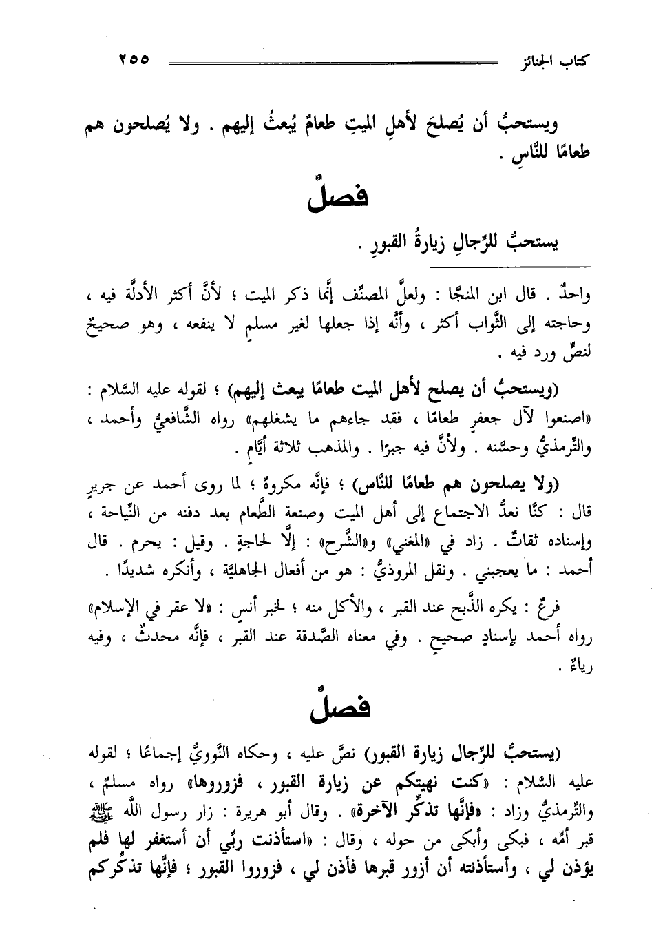 "يستحب للرجال زيارة القبور" نص عليه وحكاه النووي إجماعا لقوله عليه السلام "كنت نهيتكم عن زيارة القبور فزوروها" رواه مسلم والترمذي وزاد "فإنها تذكر الآخرة" وقال أبو هريرة زار رسول الله صلى الله عليه وسلم قبر أمه فبكى وأبكى من حوله وقال "استأذنت ربي أن استغفرا لها فلم يؤذن لي واستأذنته أن أزور قبرها فأذن لي فزوروا القبور فإنها تذكركم