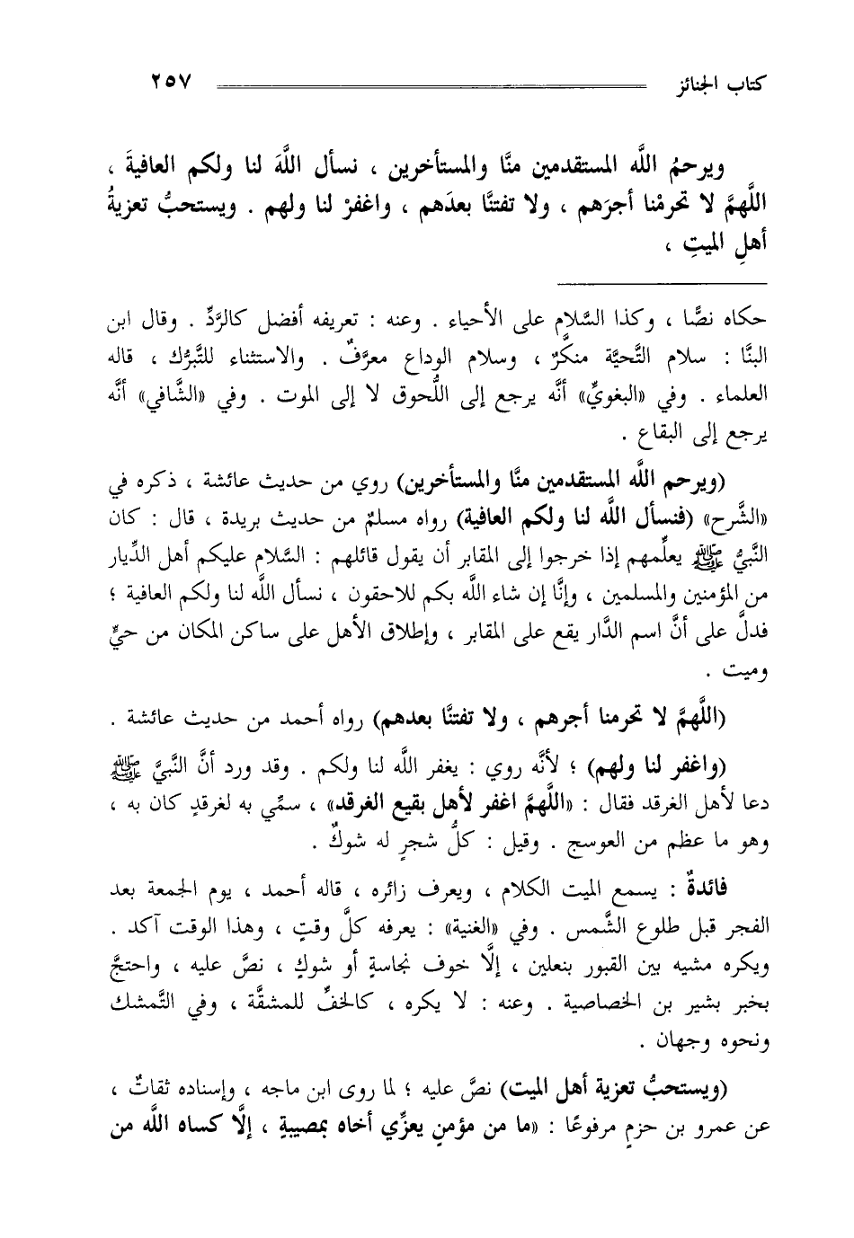 ويرحم الله المستقدمين منا والمستأخرين نسأل الله لنا ولكم العافية اللهم لا تحرمنا أجرهم ولا تفتنا بعدهم واغفر لنا ولهم ويستحب تعزية أهل الميت.