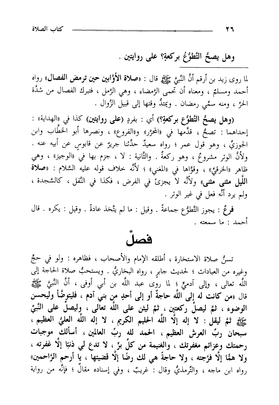 تسن صلاة الاستخارة أطلقه الإمام والأصحاب فظاهره ولو في حج وغيره من العبادات لحديث جابر رواه البخاري ويستحب صلاة الحاجة إلى الله تعالى وإلى آدمي لما روى عبد الله بن أبي أوفى أن النبي صلى الله عليه وسلم قال "من كانت له إلى الله حاجة أو إلى أحد من بني آدم فليتوضأ وليحسن الوضوء ثم ليصل ركعتين ثم ليثن على الله تعالى وليصل على النبي صلى الله عليه وسلم ثم ليقل لا إله إلا الله الحليم الكريم لا إله الله العلي العظيم سبحان رب العرش العظيم الحمد لله رب العالمين أسألك موجبات رحمتك وعزائم مغفرتك والغنيمة من كل بر لا تدع لي ذنبا إلا غفرته ولا هما إلا فرجته ولا حاجة هي لك رضى إلا قضيتها يا أرحم الراحمين" رواه ابن ماجه والترمذي وقال غريب وفي إسناده مقال فإنه من رواية