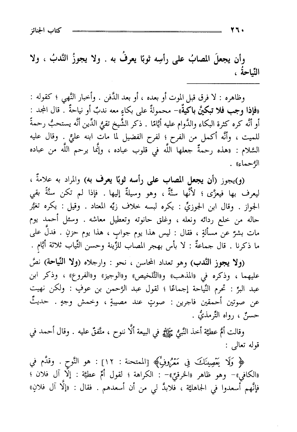 {وَلا يَعْصِينَكَ فِي مَعْرُوفٍ} [الممتحنة: من الآية12] هو النوح وقدم في الكافي وهو ظاهر الخرقي الكراهة لقول أم عطية إلا آل فلان فإنهم أسعدوا في الجاهلية فلا بد لي من أن أسعدهم فقال "إلا آل فلان"