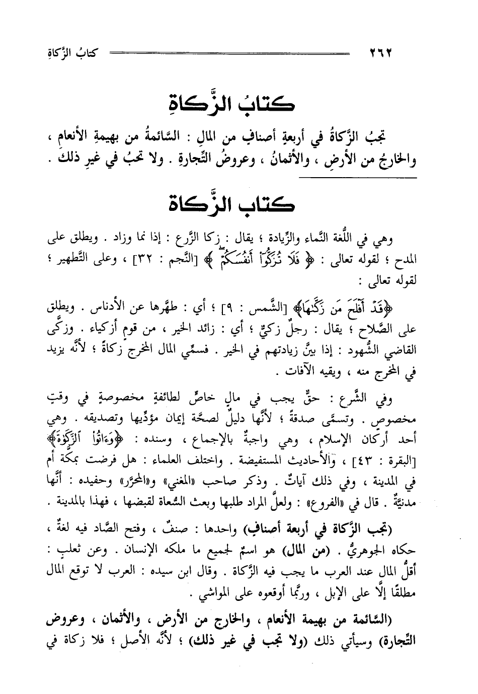 "تجب الزكاة في أربعة أصناف" واحدها صنف وفتح الصاد فيه لغة حكاه الجوهري "من المال" وهو اسم لجميع ما ملكه الإنسان وعن ثعلب أقل المال عند العرب ما يجب فيه الزكاة وقال ابن سيده العرب لا توقع المال مطلقا إلا على الإبل وربما أوقعوه على المواشي "السائمة من بهيمة الأنعام والخارج من الأرض والأثمان وعروض التجارة" وسيأتي ذلك "ولا تجب في غير ذلك" لأنه الأصل فلا زكاة في