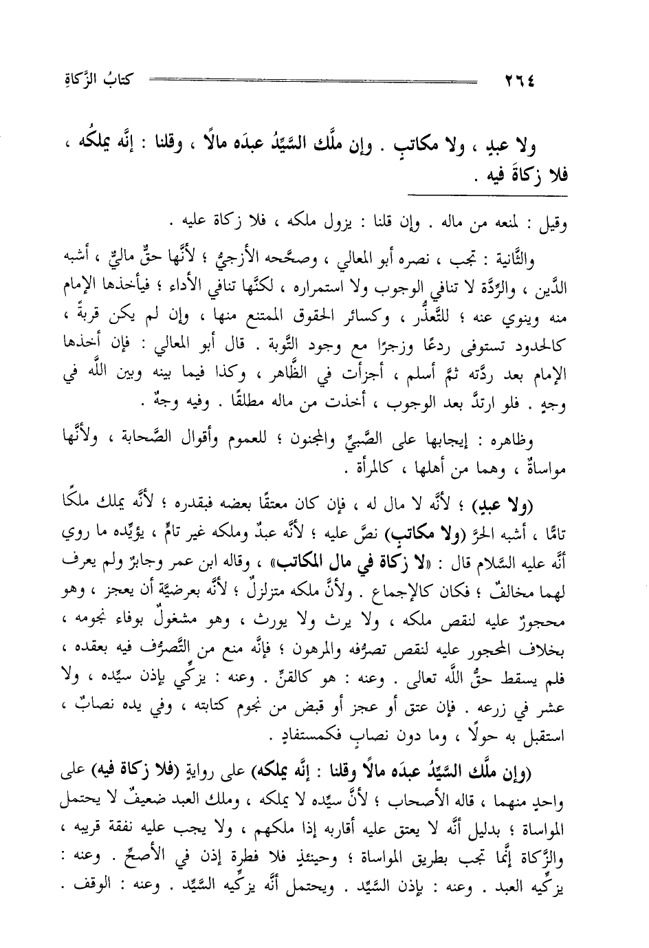 "ولا عبد" لأنه لا مال له فإن كان معتقا بعضه فبقدره لأنه يملك ملكا تاما أشبه الحر "ولا مكاتب" نص عليه لأنه عبد وملكه غير تام يؤيده ما روي أنه عليه السلام قال "لا زكاة في مال المكاتب" وقاله ابن عمر وجابر ولم يعرف لهما مخالف فكان كالإجماع ولأن ملكه متزلزل لأنه بعرضية أن يعجز وهو محجور عليه لنقص ملكه ولا يرث ولا يورث وهو مشغول بوفاء نجومه بخلاف المحجور عليه لنقص تصرفه والمرهون فإنه منع من التصرف فيه بعقده فلم يسقط حق الله تعالى وعنه هو كالقن وعنه يزكي بإذن سيده ولا عشر في زرعه فإن عتق أو عجز أو قبض من نجوم كتابته وفي يده نصاب استقبل به حولا وما دون نصاب فكمستفاد