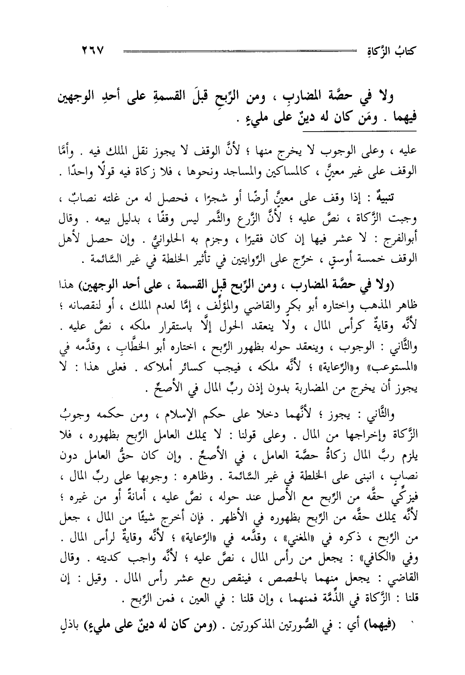 "ولا في حصة المضارب ومن الربح قبل القسمة على أحد الوجهين" هذا ظاهر المذهب واختاره أبو بكر والقاضي والمؤلف إما لعدم الملك أو لنقصانه لأنه وقاية كرأس المال ولا ينعقد الحول إلا باستقرار ملكه نص عليه والثاني: الوجوب وينعقد حوله بظهور الربح اختاره أبو الخطاب وقدمه في المستوعب و الرعاية لأنه ملكه فيجب كسائر أملاكه فعلى هذا لا يجوز أن يخرج من المضاربة بدون إذن رب المال في الأصح