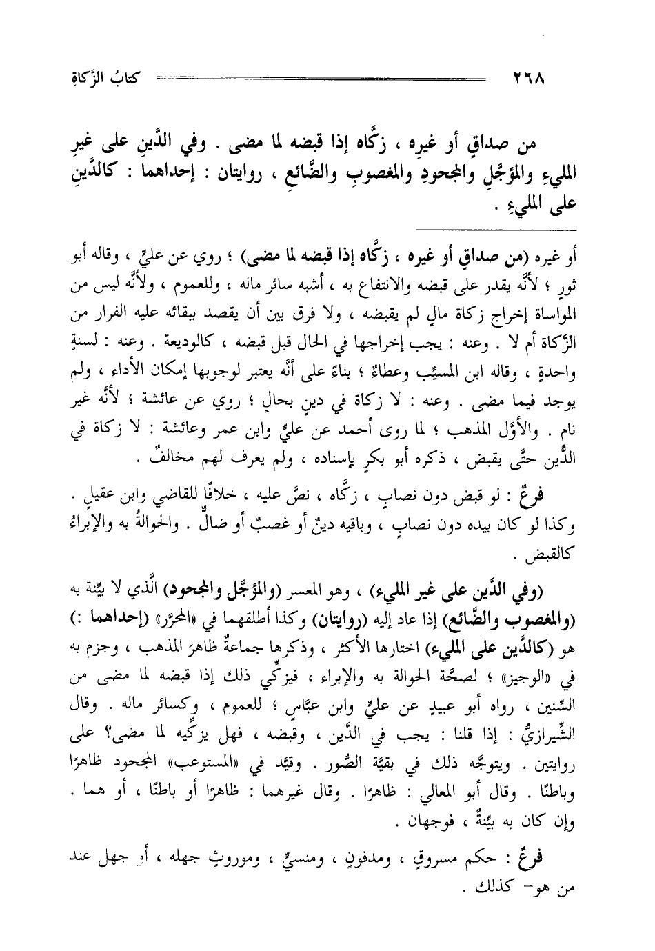 "وفي الدين على غير المليء" وهو المعسر "والمؤجل والمجحود" الذي لا بينة به "والمغصوب والضائع" إذا عاد إليه "روايتان" وكذا أطلقها في المحرر "إحداهما" هو "كالدين على المليء" اختارها الأكثر وذكرها جماعة ظاهر المذهب وجزم به في الوجيز لصحة الحوالة به والإبرار فيزكي ذلك إذا قبضه لما مضى من السنين رواه أبو عبيد عن علي وابن عباس للعموم وكسائر ماله وقال الشيرازي إذا قلنا يجب في الدين وقبضه فهل يزكيه لما مضى على روايتين ويتوجه ذلك في بقية الصور وقيد في المستوعب المجحود ظاهرا وباطنا وقال أبو المعالي ظاهرا وقال غيرهما ظاهرا أو باطنا أو هما وإن كان به بينة فوجهان.