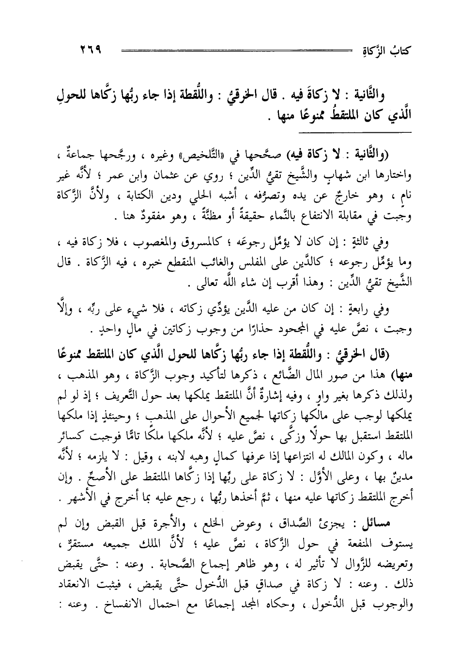 "قال الخرقي واللقطة إذا جاء ربها زكاها للحول الذي كان الملتقط ممنوعا منها" هذا من صور المال الضائع ذكرها لتأكيد وجوب الزكاة وهو المذهب ولذلك ذكرها بغير واو وفيه إشارة أن الملتقط يملكها بعد حول التعريف إذ لو لم يملكها لوجب على مالكها زكاتها لجميع الأحوال على المذهب وحينئذ إذا ملكها الملتقط استقبل بها حولا وزكى نص عليه لأنه ملكها تاما فوجبت كسائر ماله وكون المالك له انتزاعها إذا عرفها كمال وهبه لابنه وقيل لا يلزمه لأنه مدين بها وعلى الأول لا زكاة على ربها إذا زكاها الملتقط على الأصح وإن أخرج الملتقط زكاتها عليه منها ثم أخذها ربها رجع عليه بما أخرج في الأشهر.