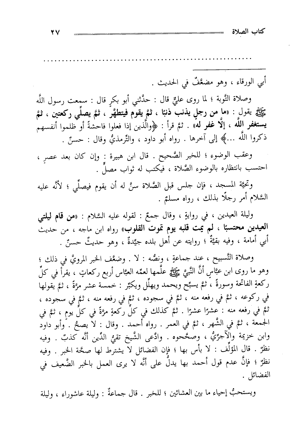 وصلاة التسبيح عند جماعة ونصه لا وضعف الخبر المروي في ذلك وهو ما روى ابن عباس أن النبي صلى الله عليه وسلم علمها لعمه العباس أربع ركعات يقرأ في كل ركعة الفاتحة وسورة ثم يسبح ويحمد ويهلل ويكبر خمسة عشر مرة ثم يقولها في ركوعه ثم في رفعه منه ثم في سجوده ثم في رفعه منه ثم في سجوده ثم في رفعه منه عشرا عشرا ثم كذلك في كل ركعة مرة في كل يوم ثم في الجمعة ثم في الشهر ثم في العمر رواه أحمد وقال لا يصح وأبو داود وابن خزيمة والآجري وصححوه وادعى الشيخ تقي الدين أنه كذب وفيه نظر قال المؤلف لا بأس بها فإن الفضائل لا يشترط لها صحة الخبر وفيه نظر فإن عدم قول أحمد بها يدل على أنه لا يرى العمل بالخبر الضعيف في الفضائل.