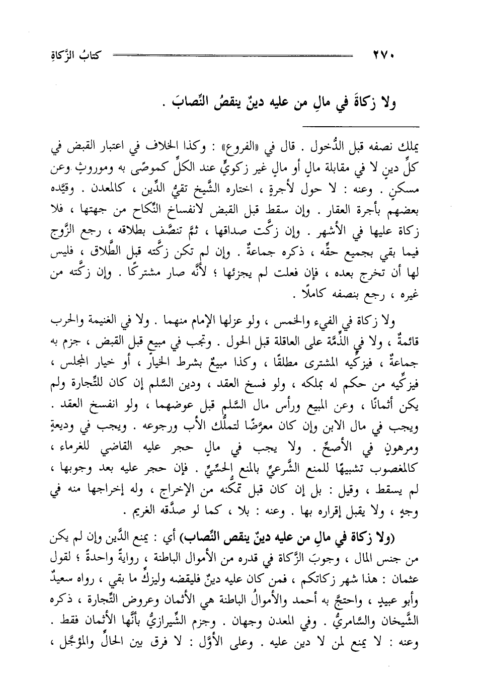 "ولا زكاة في مال من عليه دين ينقص النصاب" أي يمنع الدين وإن لم يكن من جنس المال وجوب الزكاة في قدره من الأموال الباطنة رواية واحدة لقول عثمان هذا شهر زكاتكم فمن كان عليه دين فليقضه وليزك ما بقي رواه سعيد وأبو عبيد واحتج به أحمد والأموال الباطنة هي الأثمان وعروض التجارة ذكره الشيخان والسامري وفي المعدن وجهان وجزم الشيرازي بأنها الأثمان فقط وعنه لا يمنع لمن لا دين عليه وعلى الأول لا فرق بين الحال والمؤجل ,