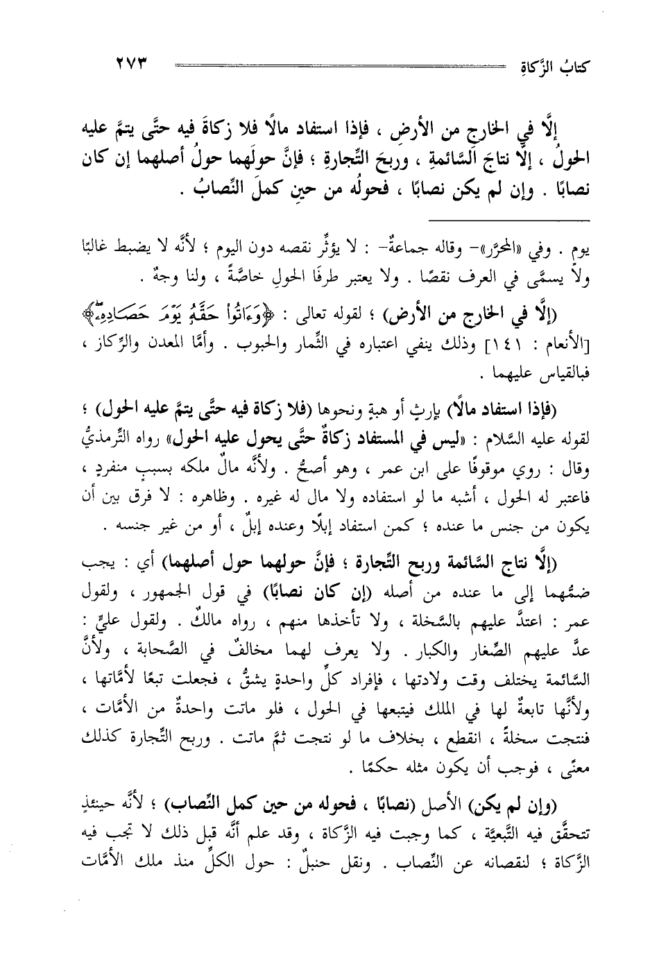 "إلا في الخارج من الأرض" لقوله تعالى {وَآتُوا حَقَّهُ يَوْمَ حَصَادِهِ} [الأنعام: من الآية141] وذلك ينفي اعتباره في الثمار والحبوب وأما المعدن والركاز فبالقياس عليهما