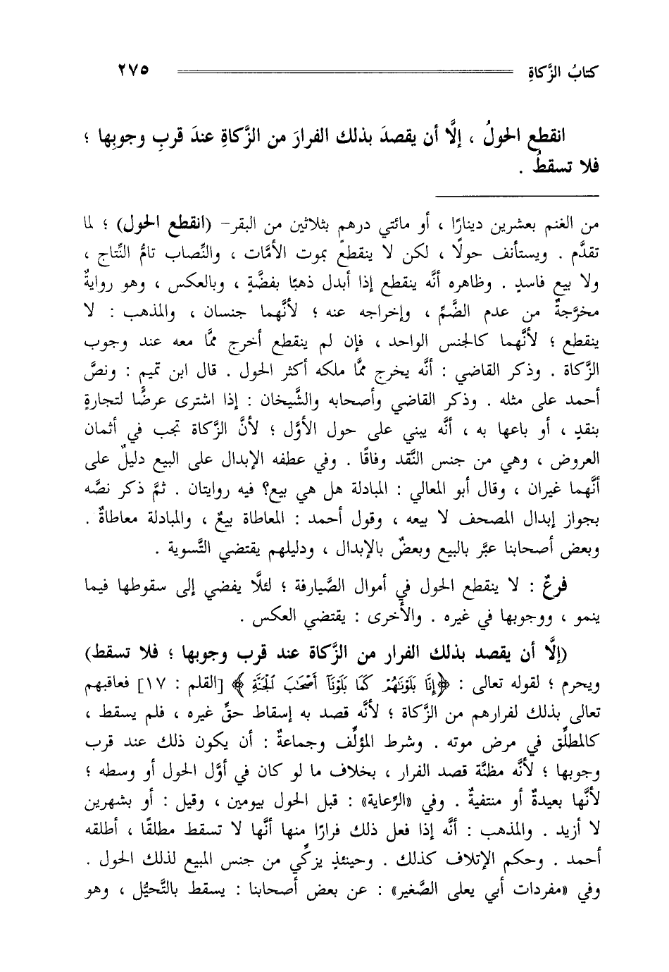 "إلا أن يقصد بذلك الفرار من الزكاة عند قرب وجوبها فلا تسقط" ويحرم لقوله تعالى {إِنَّا بَلَوْنَاهُمْ كَمَا بَلَوْنَا أَصْحَابَ الْجَنَّةِ} [القلم: من الآية17] فعاقبهم تعالى بذلك لفرارهم من الزكاة لأنه قصد به إسقاط حق غيره فلم يسقط كالمطلق في مرض موته وشرط المؤلف وجماعة أن يكون ذلك عند قرب وجوبها لأنه مظنة قصد الفرار ما لو كان في أول الحول أو وسطه لأنها بعيدة أو منتفية وفي الرعاية قبل الحول بيومين وقيل أو بشهرين لا أزيد والمذهب أنه إذا فعل ذلك فرارا منها أنها لا تسقط مطلقا أطلقه أحمد وحكم الإتلاف كذلك وحينئذ يزكي من جنس المبيع لذلك الحول.