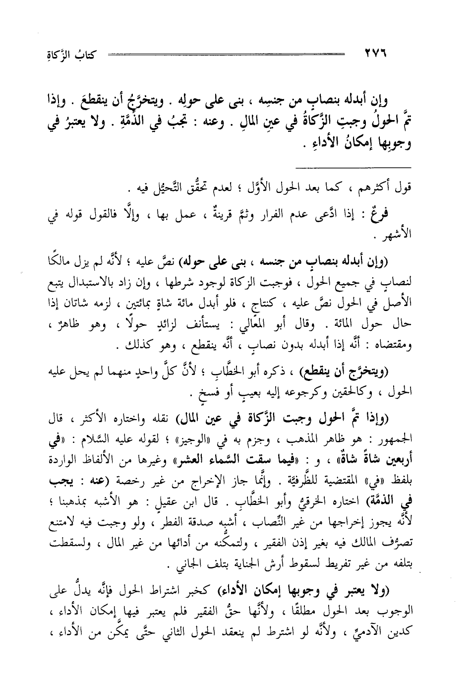 "وإن أبدله بنصاب من جنسه بنى على حوله" نص عليه لأنه لم يزل مالكا لنصاب في جميع الحول نص عليه فوجبت الزكاة لوجود شرطها وإن زاد بالاستبدال يتبع الأصل في الحول نص عليه كنتاج فلو أبدل مائة شاة بمائتين لزمه شاتان إذا حال حول المائة وقال أبو المعالي يستأنف لزائد حولا وهو ظاهر ومقتضاه أنه أبدله بدون نصاب أنه ينقطع وهو كذلك "ويتخرج أن ينقطع" ذكره أبو الخطاب لأن كل واحد منهما لم يحل عليه الحول وكالحقين وكرجوعه إليه بعيب أو فسخ.