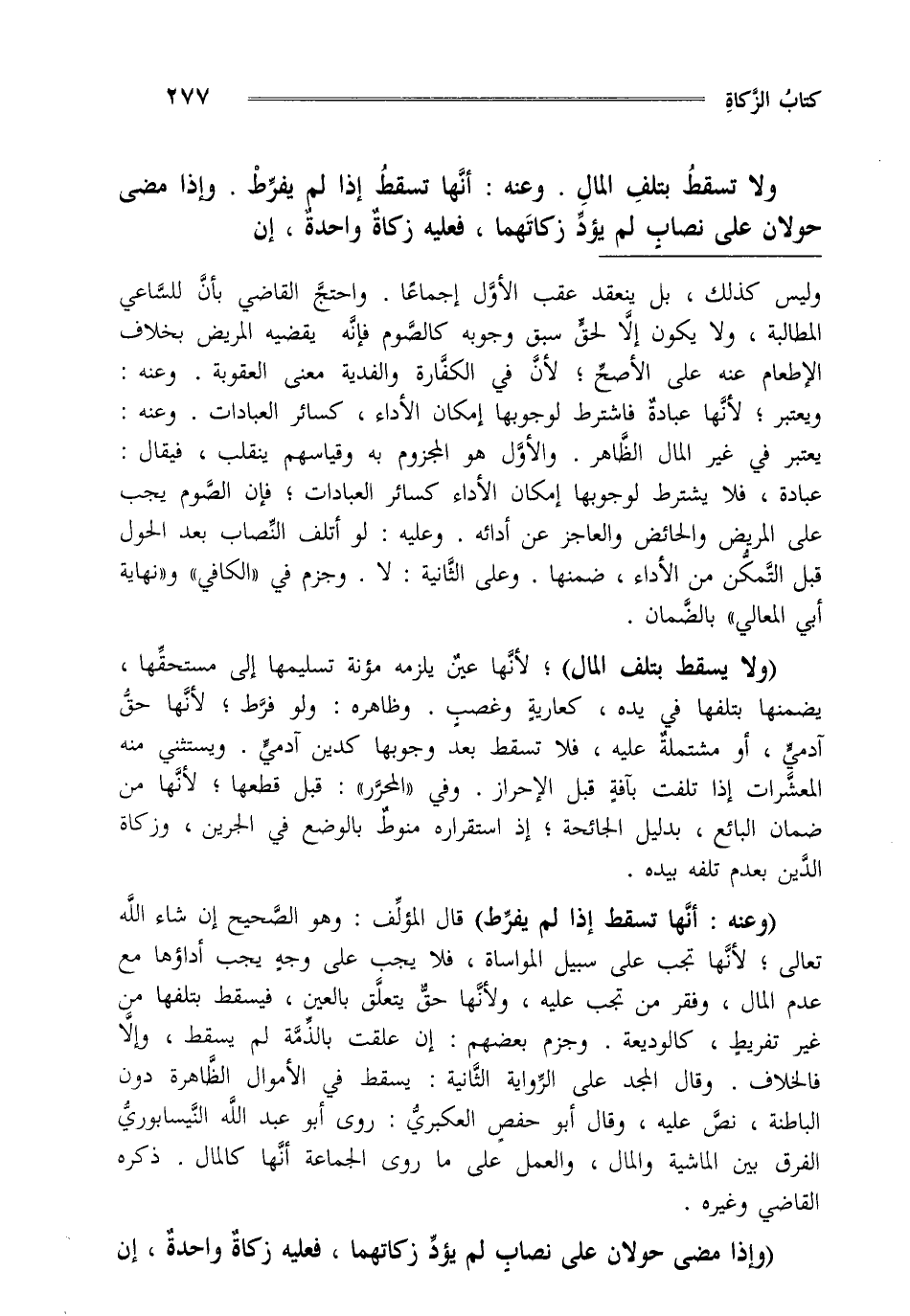 "وعنه أنها تسقط إذا لم يفرط" قال المؤلف وهو الصحيح إن شاء الله تعالى لأنها تجب على سبيل المواساة فلا يجب على وجه يجب أداؤها مع عدم المال وفقر من تجب عليه ولأنها حق يتعلق بالعين فيسقط بتلفها من غير تفريط كالوديعة وجزم بعضهم إن علقت بالذمة لم يسقط وإلا فالخلاف وقال المجد على الرواية الثانية يسقط في الأموال الظاهرة دون الباطنة نص عليه وقال أبو حفص العكبري روى أبو عبد الله النيسابوري الفرق بين الماشية والمال والعمل على ما روى الجماعة أنها كالمال ذكره القاضي وغيره.