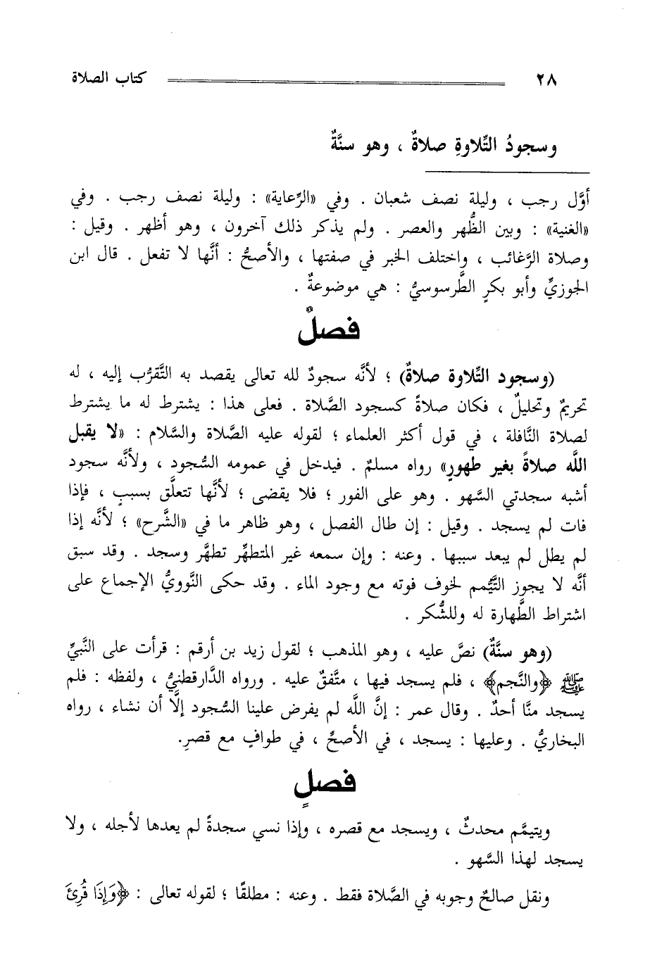 "وسجود التلاوة صلاة" لأنه سجود لله تعالى يقصد به التقرب إليه له تحريم وتحليل فكان صلاة كسجود الصلاة فعلى هذا يشترط له ما يشترط لصلاة النافلة في قول أكثر العلماء لقوله عليه الصلاة والسلام " لا يقبل الله صلاة بغير طهور " رواه مسلم فيدخل في عمومه السجود ولأنه سجود أشبه سجدتي السهو وهو على الفور فلا يقضي لأنها تتعلق بسبب فإذا فات لم يسجد وقيل إن طال الفصل: وهو ظاهر ما في الشرح لأنه إذا لم يطل لم يبعد سببها وعنه وإن سمعها غير المتطهر تطهر وسجد وقد سبق أنه لا يجوز التيمم لخوفه فوته مع وجود الماء وقد حكى النووي الإجماع على اشتراط الطهارة له وللشكر.