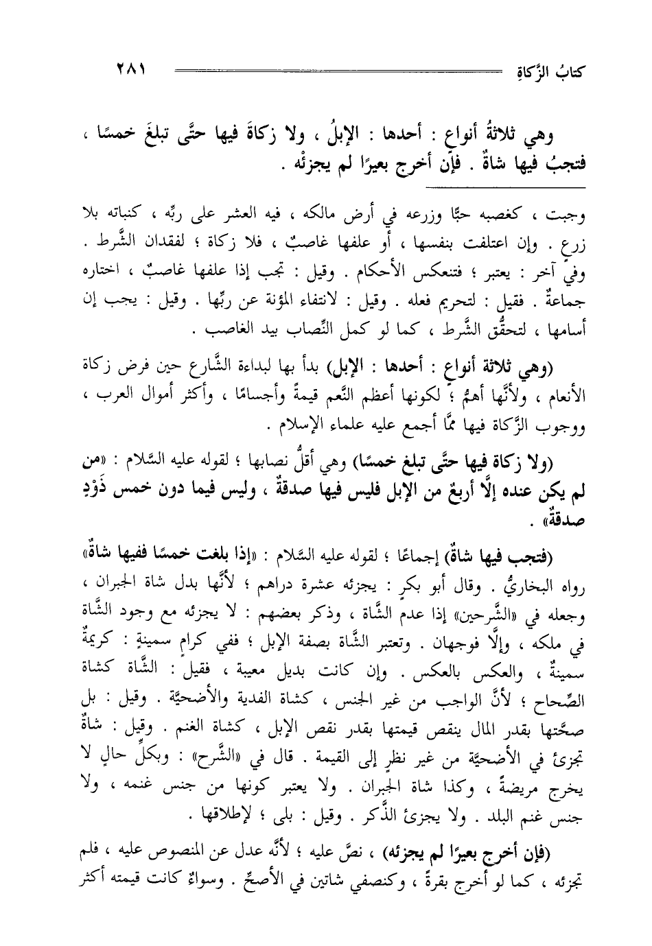 "فتجب فيها شاة" إجماعا لقوله عليه السلام "إذا بلغت خمسا ففيها شاة" رواه البخاري وقال أبو بكر يجزئه عشرة دراهم لأنها بدل شاة الجبران وجعله في الشرحين إذا عدم الشاة وذكر بعضهم لا يجزئه مع وجود الشاة في ملكه وإلا فوجهان وتعتبر الشاة بصفة الإبل ففي كرام سمينة كريمة سمينة والعكس بالعكس وإن كانت بديل معيبة فقيل الشاة كشاة الصحاح لأن الواجب من غير الجنس كشاة الفدية والأضحية وقيل بل صحتها بقدر المال ينقص قيمتها بقدر نقص الإبل كشاة الغنم وقيل شاة تجزيء في الأضحية من غير نظر إلى القيمة قال في الشرح وبكل حال لا يخرج مريضة وكذا شاة الجبران ولا يعتبر كونها من جنس غنمه ولا جنس غنم البلد ولا يجزئ الذكر وقيل بلا لإطلاقها.