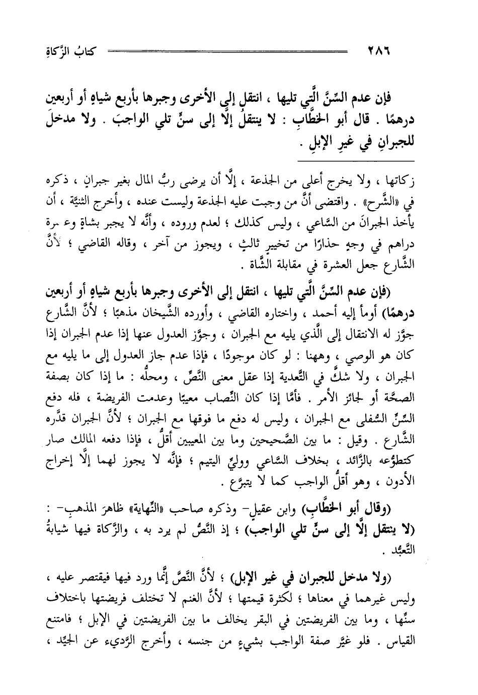 فإن عدم السن التي تليها انتقل إلى الأخرى وجبرها بأربع شياه أو أربعين درهما قال أبو الخطاب لا ينتقل إلا إلى سن تلي الواجب ولا مدخل للجبران في غير الإبل.