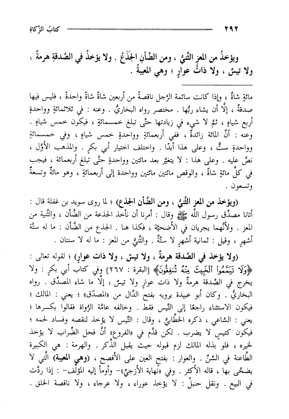 ويؤخذ من المعز الثني ومن الضأن الجذع ولا يؤخذ في الصدقة هرمة ولا تيس ولا ذات عوار وهي المعيبة.