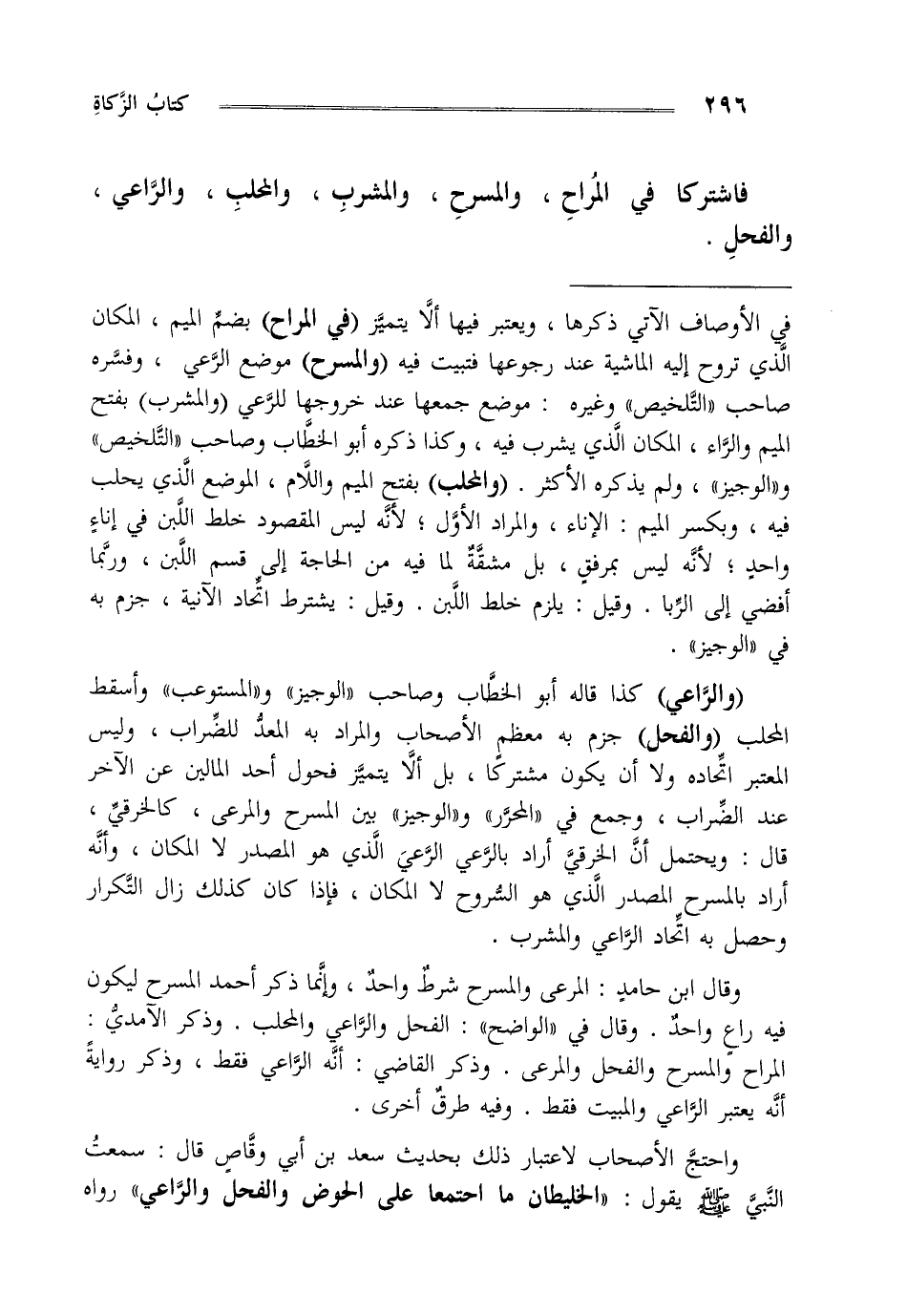 وقال ابن حامد المرعى والمسرح شرط واحد وإنما ذكر أحمد المسرح ليكون فيه راع واحد وقال في الواضح الفحل والراعي والمحلب وذكر الآمدي المراح والمسرح والفحل والمرعى وذكر القاضي أنه الراعي فقط وذكر رواية أنه يعتبر الراعي والمبيت فقط وفيه طرق أخرى واحتج الأصحاب لاعتبار ذلك بحديث سعد بن أبي وقاص قال سمعت النبي صلى الله عليه وسلم يقول "الخليطان ما اجتمعا على الحوض والفحل والراعي" رواه