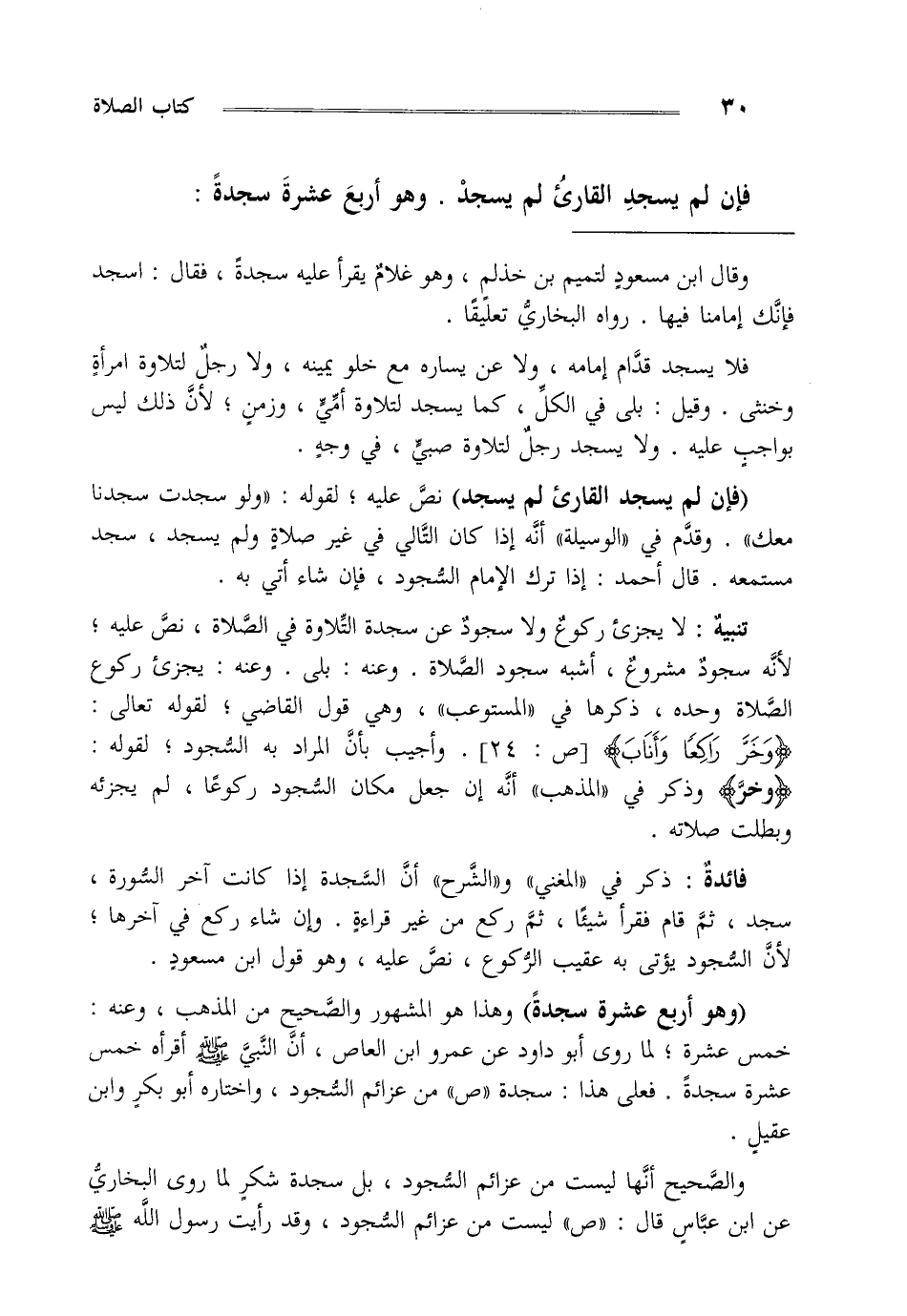 فائد: ذكر في المغني و الشرح أن السجدة إذا كانت آخر السورة سجد ثم قام فقرأ شيئا ثم ركع من غير قراءة وإن شاء ركع في آخرها لأن السجود يؤتى به عقيب الركوع نص عليه وهو قول ابن مسعود.