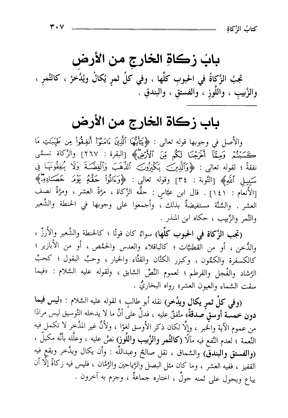 والأصل في وجوبها قوله تعالى {يَا أَيُّهَا الَّذِينَ آمَنُوا أَنْفِقُوا مِنْ طَيِّبَاتِ مَا كَسَبْتُمْ وَمِمَّا أَخْرَجْنَا لَكُمْ مِنَ الْأَرْضِ} [البقرة: من الآية267] والزكاة تسمى نفقة لقوله تعالى {وَالَّذِينَ يَكْنِزُونَ الذَّهَبَ وَالْفِضَّةَ وَلا يُنْفِقُونَهَا فِي سَبِيلِ اللَّهِ} [التوبة: من الآية34] وقوله تعالى {وَءآتُوا حَقَّهُ يَوْمَ حَصَادِه} [الأنعام: من الآية141] الأنعام قال ابن عباس حقه الزكاة مرة العشر ومرة نصف العشر والسنة مستفيضة بذلك وأجمعوا على وجوبها في الحنطة والشعير والتمر والزبيب حكاه ابن المنذر.