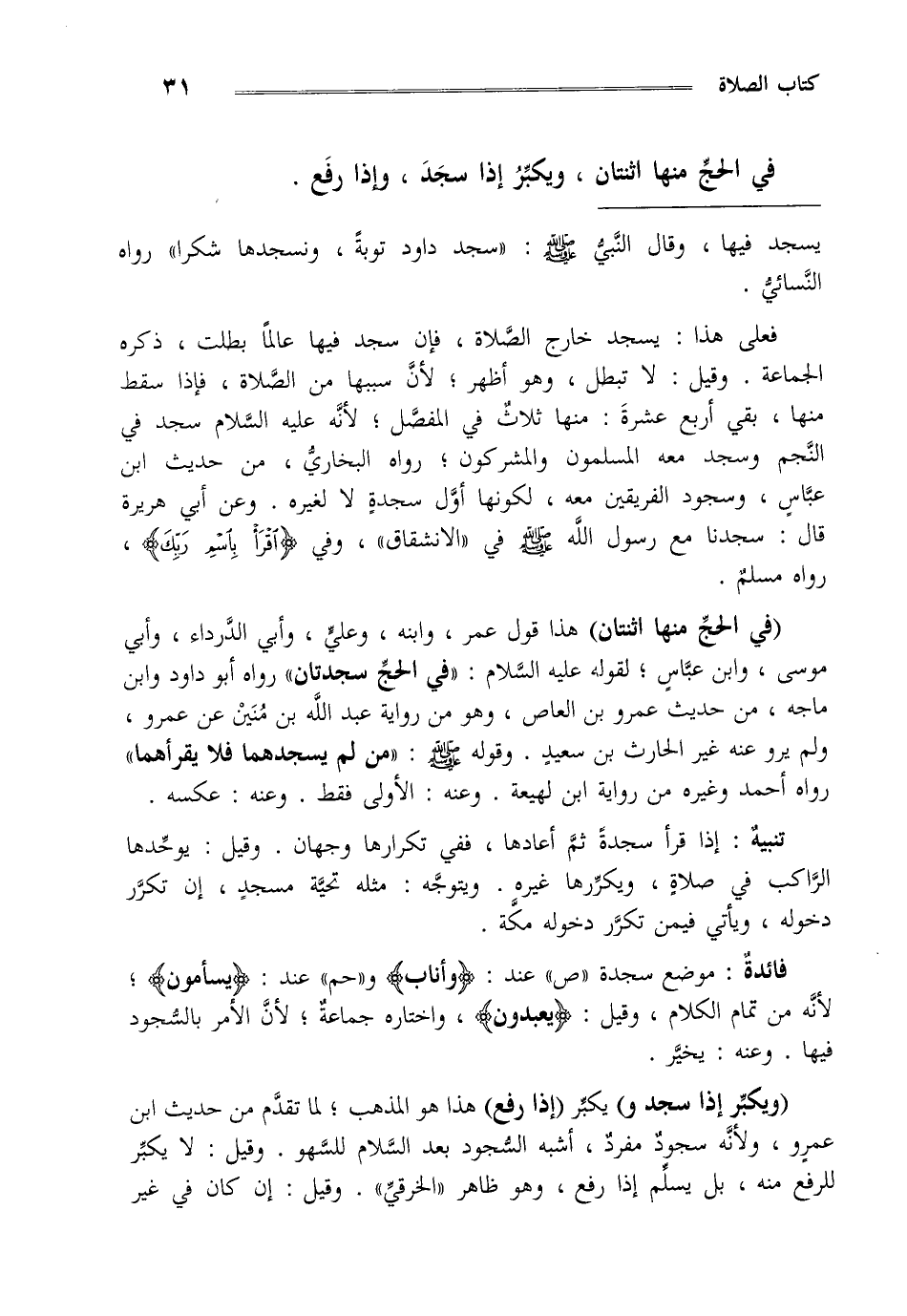 "ويكبر إذا سجد و"يكبر "إذا رفع" هذا هو المذهب لما تقدم من حديث ابن عمرو ولأنه سجود مفرد أشبه السجود بعد السلام للسهو وقيل لا يكبر للرفع منه بل يسلم إذا رفع وهو ظاهر الخرقي وقيل إن كان في غير