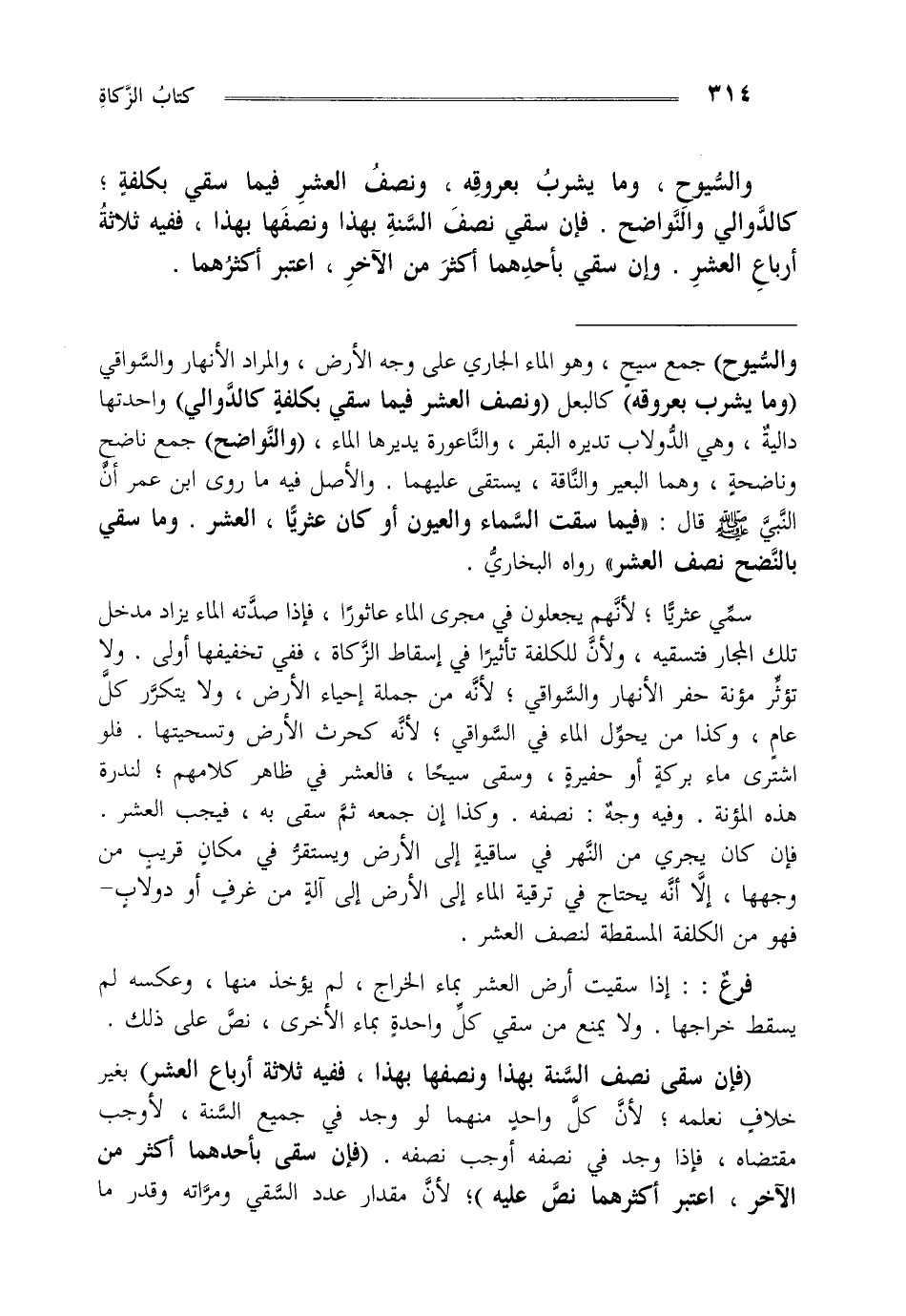 والسيوح" جمع سيح وهو الماء الجاري على وجه الأرض والمراد الأنهار والسواقي "وما يشرب بعروقه" كالبعل "ونصف العشر فيما سقي بكلفة كالدوالي" واحدتها دالية وهي الدولاب تديره البقر والناعورة تديرها الماء "والنواضح" جمع ناضح وناضحة وهما البعير والناقة يستقى عليهما والأصل فيه ما روى ابن عمر أن النبي صلى الله عليه وسلم قال "فيما سقت السماء والعيون أو كان عثريا العشر وما سقي بالنضح نصف العشر" رواه البخاري