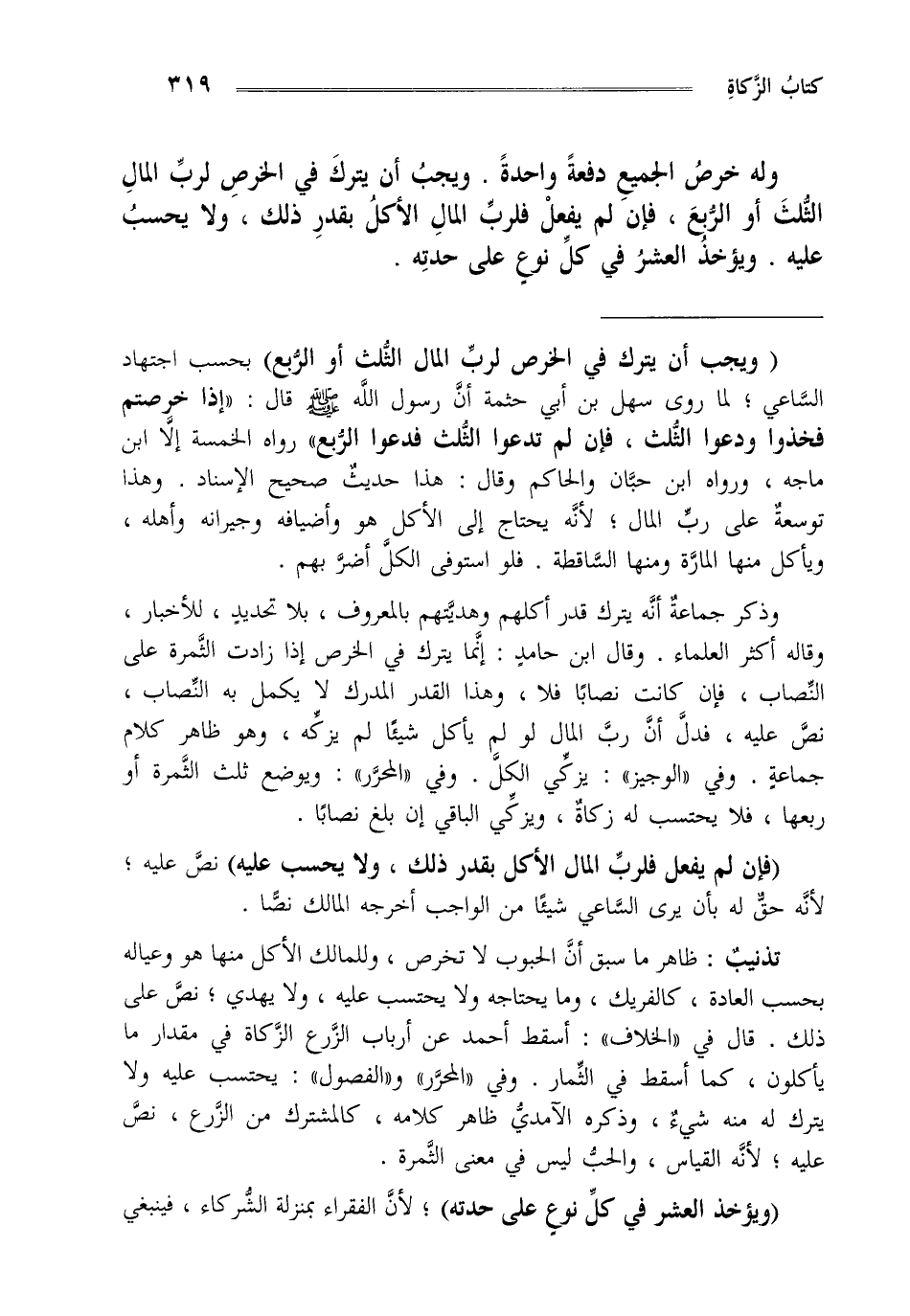 "ويجب أن يترك في الخرص لرب المال الثلث أو الربع" بحسب اجتهاد الساعي لما روى سهل بن أبي حثمة أن رسول الله صلى الله عليه وسلم قال "إذا خرصتم فخذوا ودعوا الثلث فإن لم تدعوا الثلث فدعوا الربع" رواه الخمسة إلا ابن ماجه ورواه ابن حبان والحاكم وقال هذا حديث صحيح الإسناد وهذا توسعة على رب المال لأنه يحتاج إلى الأكل هو وأضيافه وجيرانه وأهله ويأكل منها المارة ومنها الساقطة فلو استوفى الكل أضربهم.