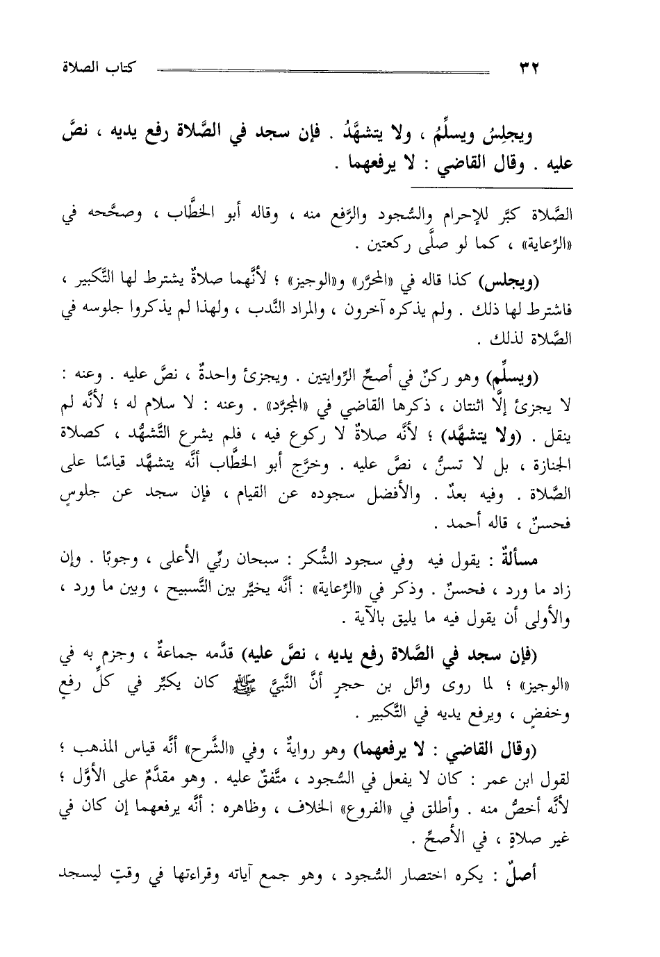 ويجلس ويسلم ولا يتشهد فإن سجد في الصلاة رفع يديه نص عليه وقال القاضي : لا يرفعهما.