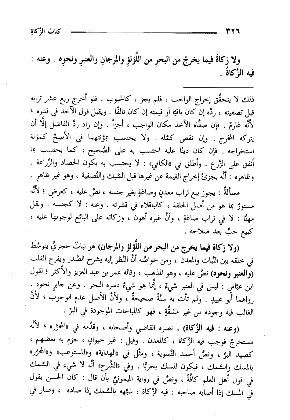 "ولا زكاة فيما يخرج من البحر من اللؤلؤ والمرجان" هو نبات حجري يتوسط في خلقه بين النبات والمعدن ومن خواصه أن النظر إليه يشرح الصدر ويفرح القلب "والعنبر ونحوه" نص عليه وهو المذهب وقاله عمر بن عبد العزيز والأكثر لقول ابن عباس ليس في العنبر شيء إنما هو شيء دسره البحر وعن جابر نحوه رواهما أبو عبيد ولم تأت به سنة صحيحة ولأن الأصل عدم الوجوب لأن الغالب فيه وجوده من غير مشقة فهو كالمباحات الموجودة في البر