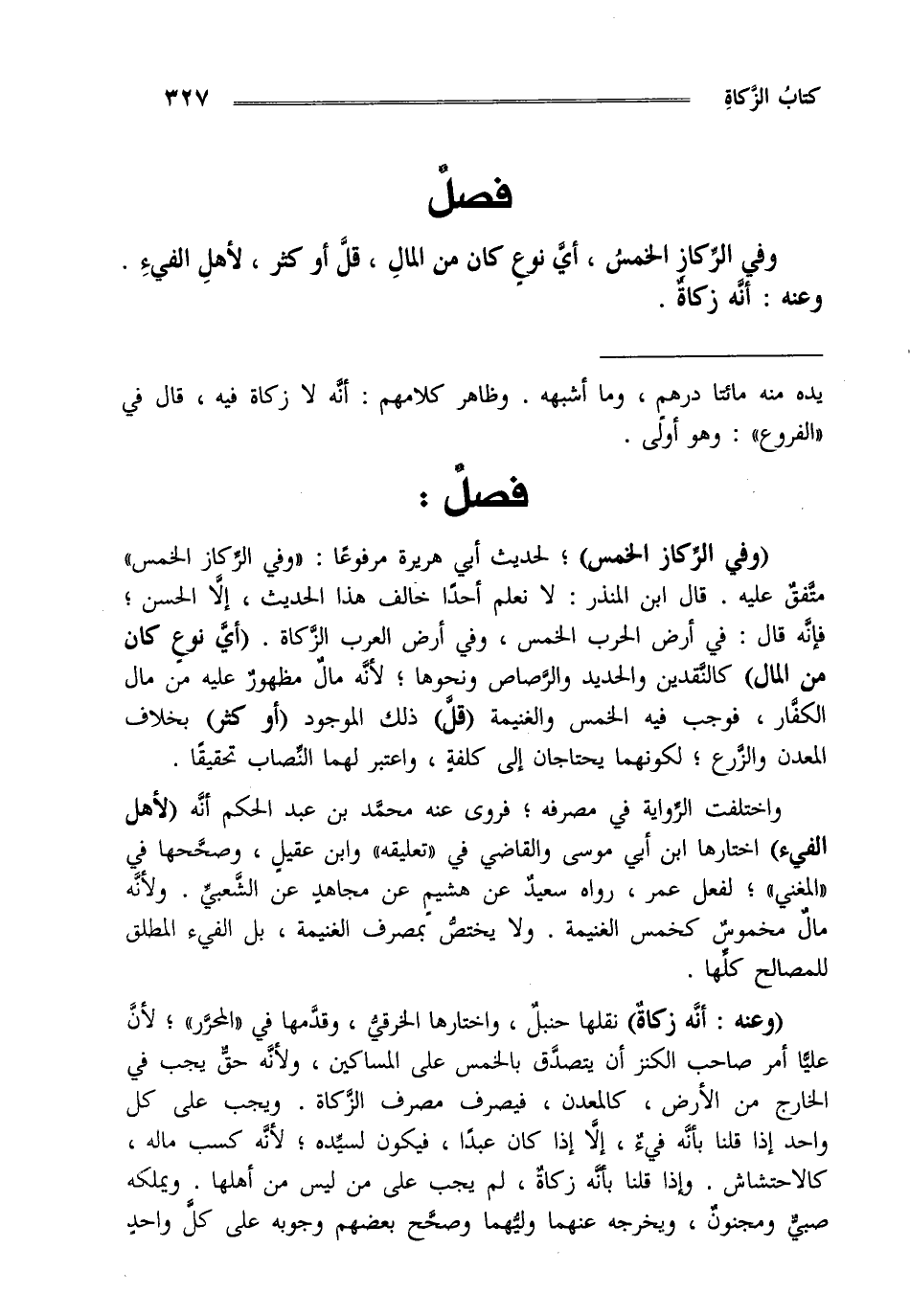 "وفي الركاز الخمس" لحديث أبي هريرة مرفوعا "وفي الركاز الخمس" متفق عليه قال ابن المنذر لا نعلم أحدا خالف هذا الحديث إلا الحسن فإنه قال في أرض الحرب الخمس وفي أرض العرب الزكاة "أي نوع كان من المال" كالنقدين والحديد والرصاص ونحوها لأنه مال مظهور عليه من مال الكفار فوجب فيه الخمس والغنيمة "قل" ذلك الموجود "أو أكثر" بخلاف المعدن والزرع لكونهما يحتاجان إلى كلفة واعتبر لهما النصاب تحقيقا واختلفت الرواية في مصرفه فروى عنه محمد بن عبد الحكم أنه "لأهل الفيء" اختارها ابن أبي موسى والقاضي في تعليقه وابن عقيل وصححها في المغني لفعل عمر رواه سعيد عن هشيم عن مجاهد عن الشعبي ولأنه مال مخموس كخمس الغنيمة ولا يختص بمصرف الغنيمة بل الفيء المطلق للمصالح كلها