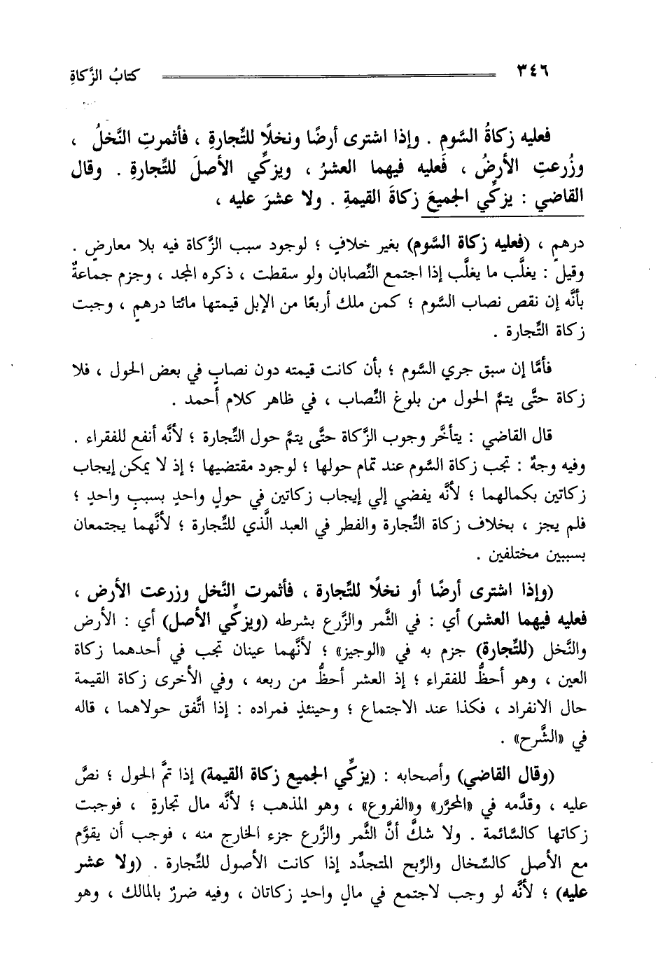 "وقال القاضي" وأصحابه "يزكي الجميع زكاة القيمة" إذا تم الحول نص عليه وقدمه في المحرر والفروع وهو المذهب لأنه مال تجارة فوجبت زكاتها كالسائمة ولا شك أن الثمر والزرع جزء الخارج منه فوجب أن يقوم مع الأصل كالسخال والربح المتجدد إذا كانت الأصول للتجارة "ولا عشر عليه" لأنه لو وجب لاجتمع في مال واحد زكاتان وفيه ضرر بالمالك وهو