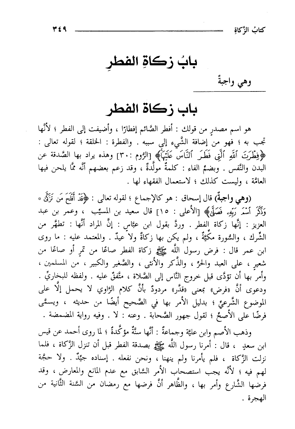 "وهي واجبة" قال إسحق هو كالإجماع لقوله تعالى {قَدْ أَفْلَحَ مَنْ تَزَكَّى وَذَكَرَ اسْمَ رَبِّهِ فَصَلَّى} [الأعلى:15] الأعلى قال سعيد بن المسيب وعمر بن عبد العزيز إنها زكاة الفطر ورد بقول ابن عباس إن المراد إنها تطهر من الشرك والسورة مكية ولم يكن بها زكاة ولا عيد والمعتمد عليه ما روى ابن عمر قال فرض رسول الله صلى الله عليه وسلم زكاة الفطر صاعا من تمر أو صاعا من شعير على العبد والحر والذكر والأنثى والصغير والكبير من المسلمين وأمر بها أن تؤدى قبل خروج الناس إلى الصلاة متفق عليه ولفظه للبخاري ودعوى أن فرض بمعنى قدر مردود بأن كلام الراوي لا يحمل إلا على الموضوع الشرعي بدليل الأمر بها في الصحيح أيضا من حديثه ويسمى فرضا على الأصح لقول جمهور الصحابة وعنه لا وفيه رواية المضمضة