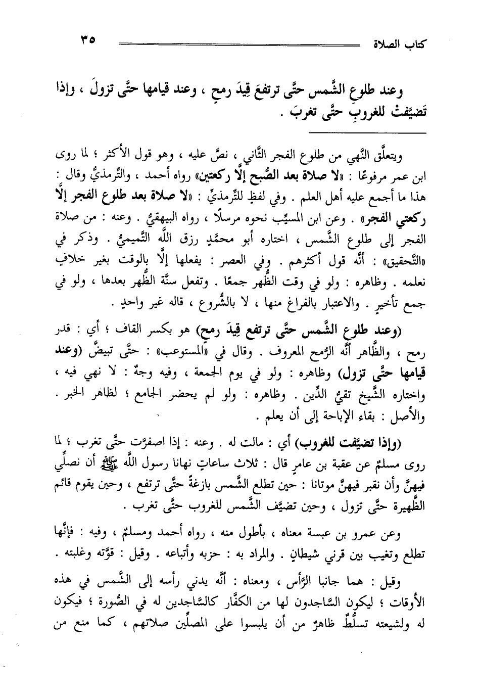 "وعند طلوع الشمس حتى ترتفع قيد رمح" هو بكسر القاف أي قدر رمح والظاهر أنه الرمح المعروف وقال في المستوعب حتى تبيض وعند قيامها حتى تزول وظاهره ولو في يوم الجمعة وفيه وجه لا نهي فيه واختاره الشيخ تقي الدين وظاهره ولو لم يحضر الجامع لظاهر الخبر والأصل بقاء الإباحة إلى أن يعلم.