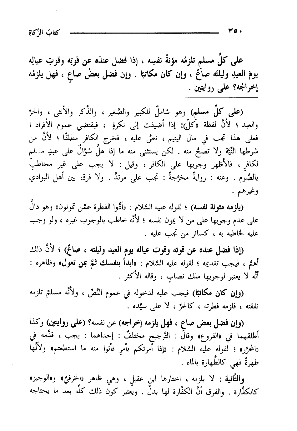 على كل مسلم تلزمه مؤنة نفسه إذا فضل عنده عن قوته وقوت عياله يوم العيد وليلته صاع وإن كان مكاتبا وإن فضل بعض صاع فهل يلزمه إخراجه؟ على روايتين.