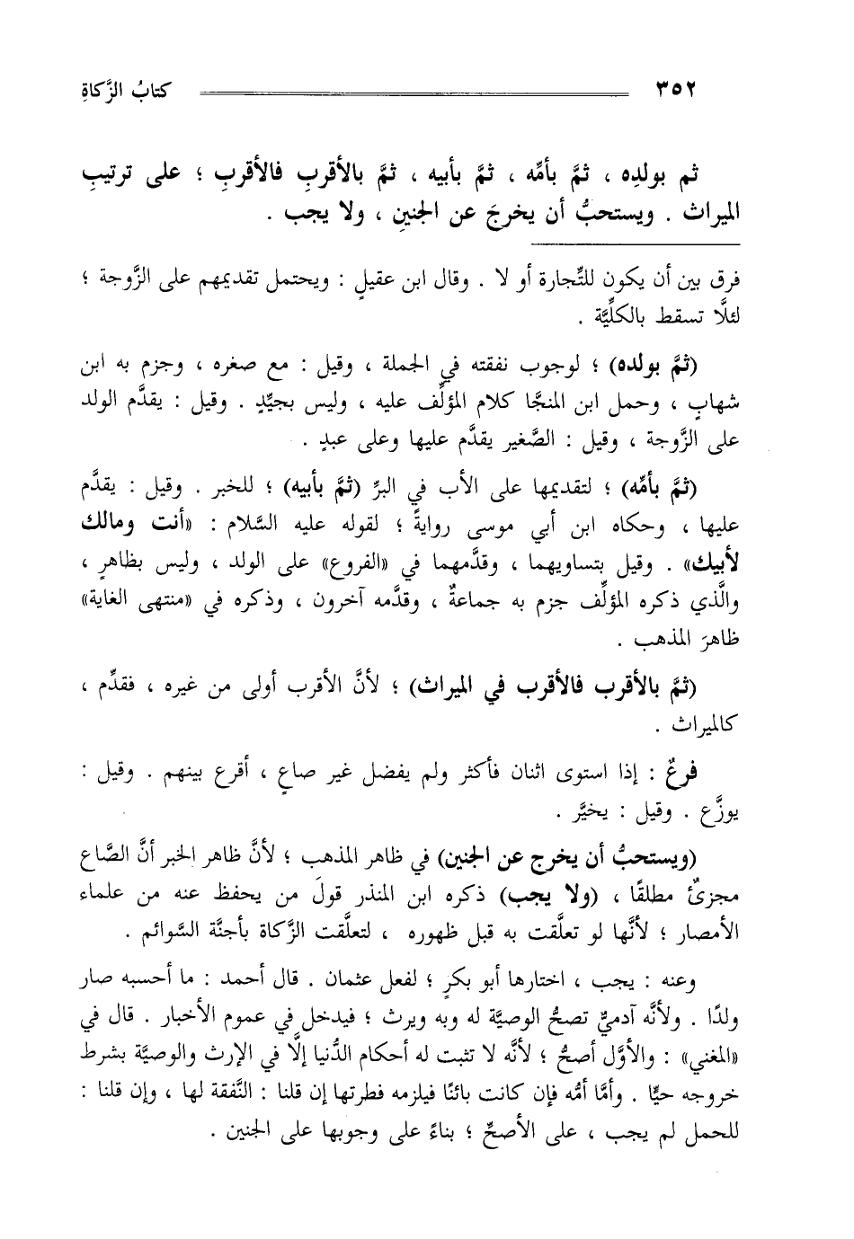 ثم بولده ثم بأمه ثم بأبيه ثم بالأقرب فالأقرب على ترتيب الميراث ويستحب أن يخرج عن الجنين ولا يجب.