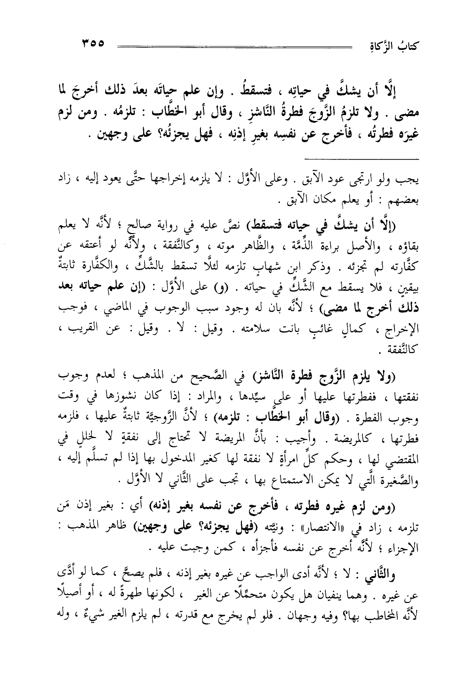 إلا أن يشك في حياته فتسقط وإن علم حياته بعد ذلك أخرج لما مضى ولا تلزم الزوج فطرة الناشز وقال أبو الخطاب: تلزمه ومن لزم غيره فطرته فأخرج عن نفسه بغير إذنه فهل يجزئه؟ على وجهين.