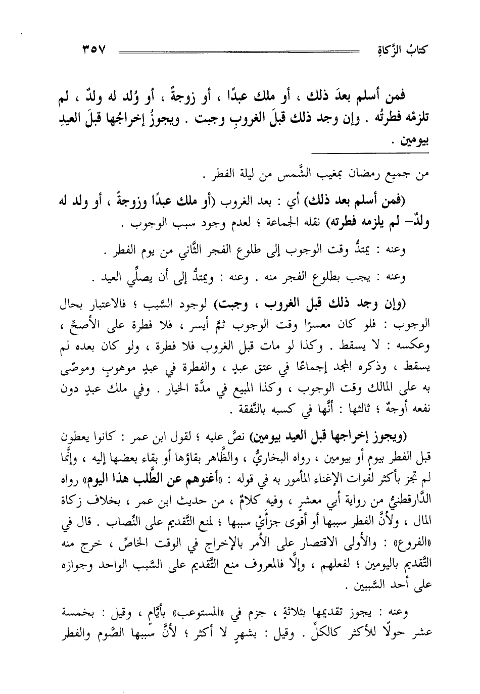 "فمن أسلم بعد ذلك" أي بعد الغروب "أو ملك عبدا وزوجة أو ولد له ولد لم يلزمه فطرته" نقله الجماعة لعدم وجود سبب الوجوب