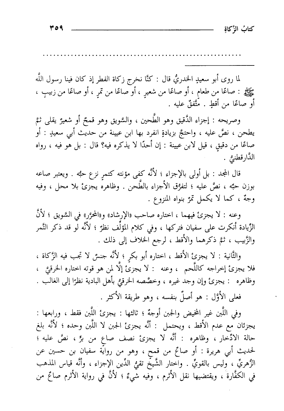 وفي اللبن غير المخيض والجبن أوجه ثالثها يجزئ اللبن فقط ورابعها يجزئان مع عدم الأقط ويحتمل أنه يجزئ الجبن لا اللبن وحده لأنه بلغ حالة الادخار وظاهره أنه لا يجزئ نصف صاع من بر نص عليه لحديث أبي هريرة أو صاع من قمح وهو من رواية سفيان بن حسين عن الزهري وليس بالقوي واختار الشيخ تقي الدين الإجزاء وأنه قياس المذهب في الكفارة ويقتضيها نقل الأثرم وفيه شيء لأن في رواية الأثرم صاع من