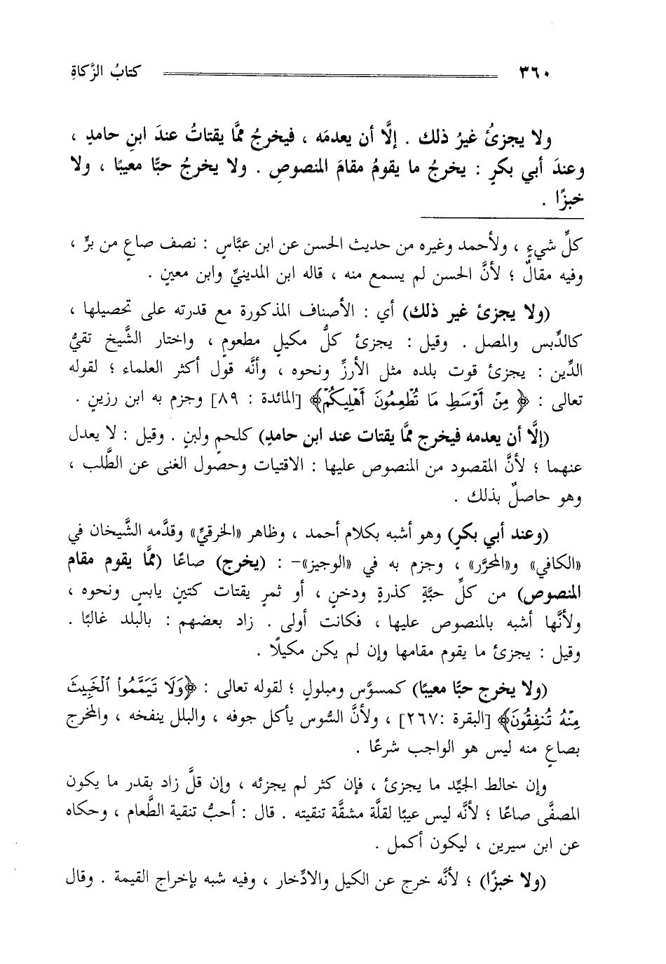 وإن خالط الجيد ما يجزئ فإن كثر لم يجزئه وإن قل زاد بقدر ما يكون المصفى صاعا لأنه ليس عيبا لقلة مشقة تنقيته قال أحب تنقية الطعام وحكاه عن ابن سيرين ليكون أكمل "ولا خبزا" لأنه خرج عن الكيل والادخار وفيه شبه بإخراج القيمة وقال