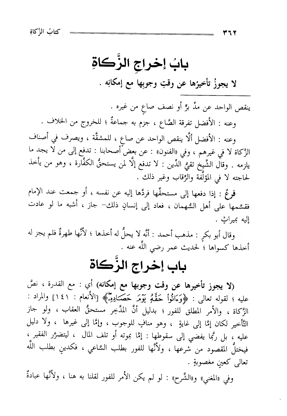 "لا يجوز تأخيرها عن وقت وجوبها مع إمكانه" أي مع القدرة نص عليه لقوله تعالى {وَآتُوا حَقَّهُ يَوْمَ حَصَادِهِ} [الأنعام: من الآية141] والمراد الزكاة والأمر المطلق للفور بدليل أن المدخر مستحق العقاب ولو جاز التأخير لكان إما إلى غاية وهو مناف للوجوب وإما إلى غيرها ولا دليل عليه بل ربما يفضي إلى سقوطها إما بموته أو تلف المال ليتضرر الفقير فيختل المقصود من شرعها ولأنها للفور بطلب الساعي فكدين بطلب الله تعالى كعين مغصوبة