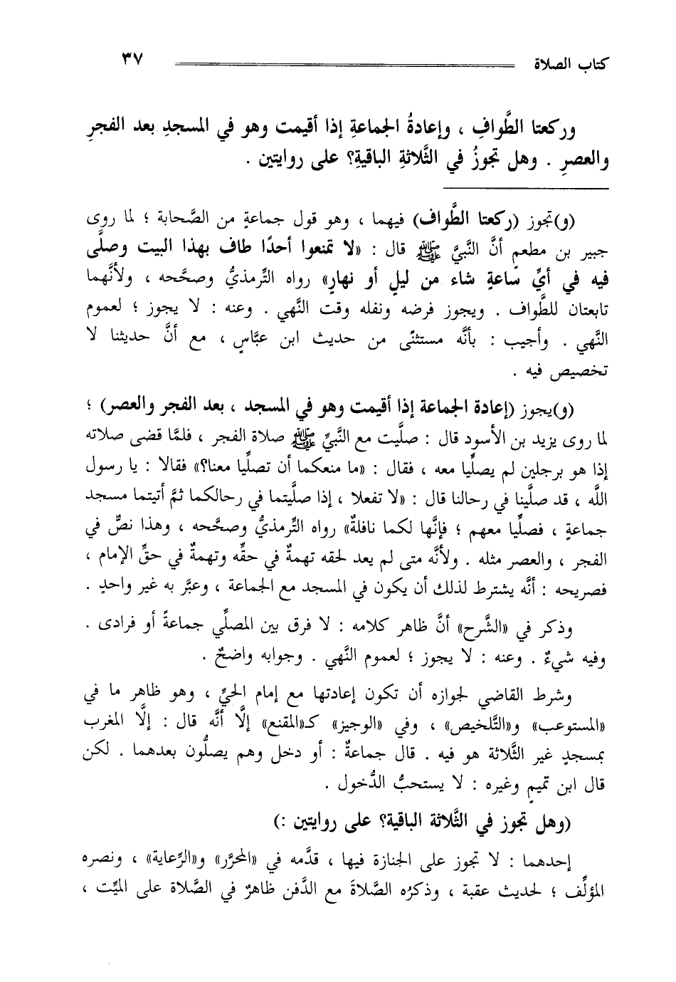 "و" يجوز "إعادة الجماعة إذا أقيمت وهو في المسجد بعد الفجر والعصر" لما روى يزيد بن الأسود قال صليت مع النبي صلى الله عليه وسلم صلاة الفجر فلما قضى صلاته إذا هو برجلين لم يصليا معه فقال ما منعكما أن تصليا معنا فقالا يا رسول الله قد صلينا في رحالنا قال لا تفعلا إذا صليتما في رحالكما ثم أتيتما مسجد جماعة فصليا معهم فإنها لكما نافلة رواه الترمذي وصححه وهذا نص في الفجر والعصر مثله ولأنه متى لم يعد لحقه تهمة في حقه وتهمة في حق الإمام فصريحه أنه يشترط لذلك أن يكون في المسجد مع الجماعة وعبر به غير واحد.